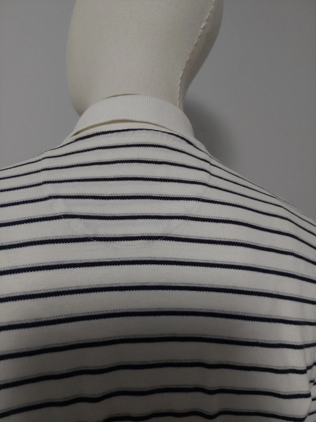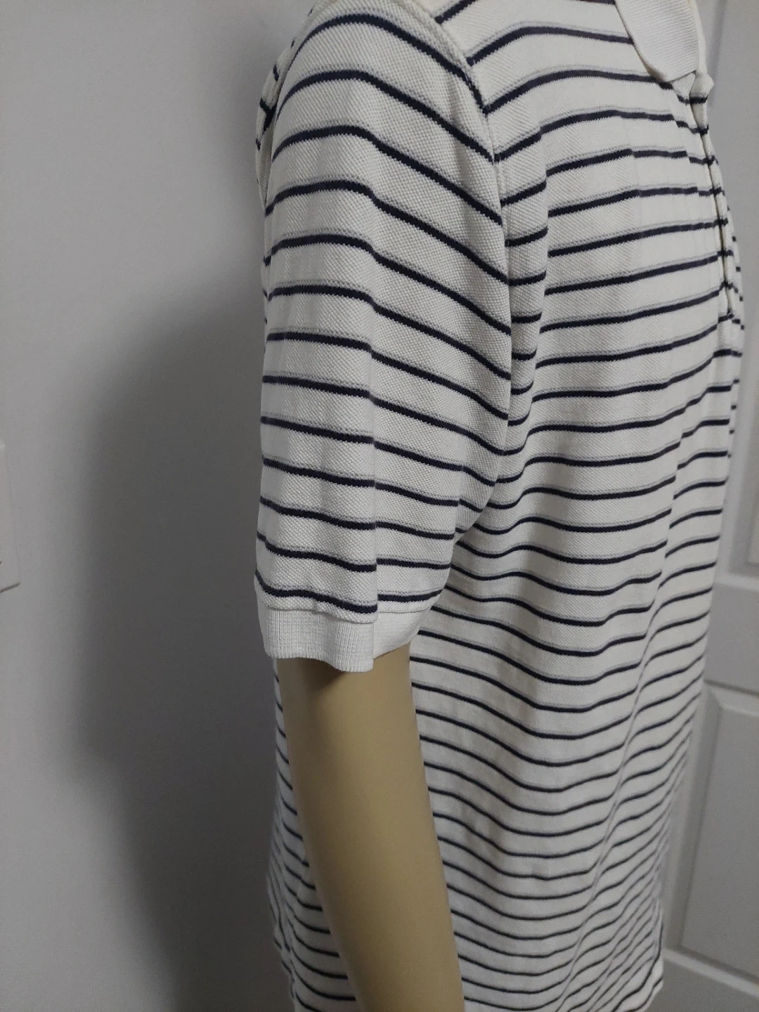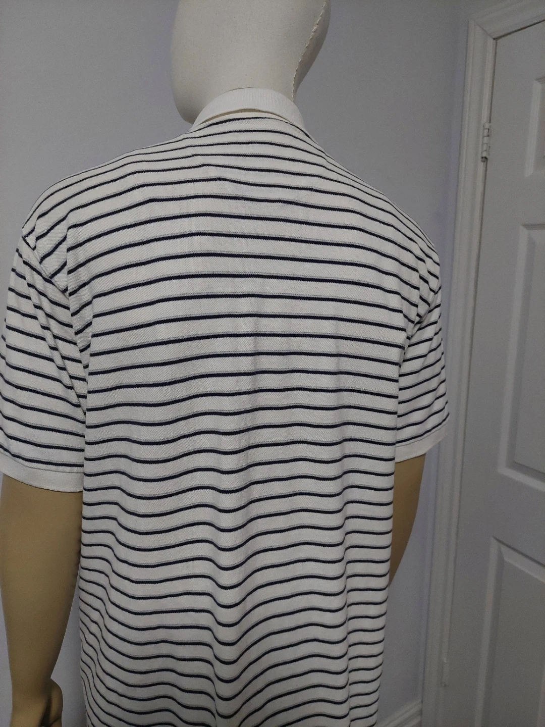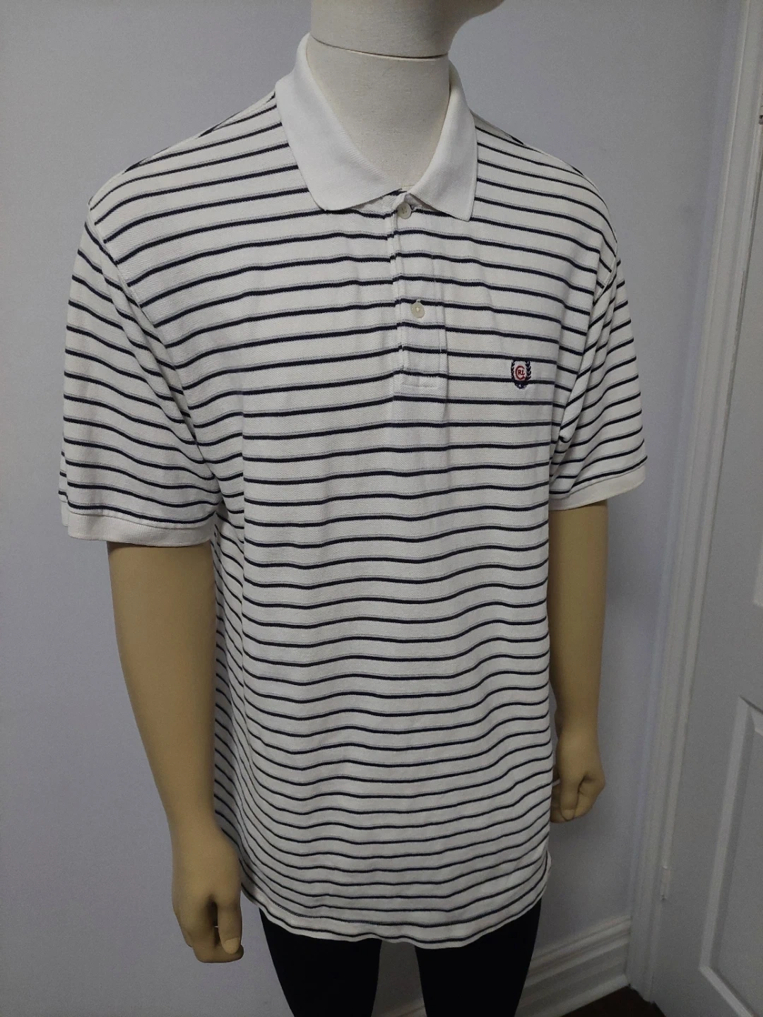 Chaps Ralph Lauren polo shirt with a white and navy stripe pattern. Add a classic, preppy touch to your wardrobe with this authentic vintage Chaps by Ralph Lauren polo shirt. Featuring a timeless horizontal striped pattern and the iconic embroidered Chaps crest on the chest, this shirt offers a perfect retro 90s aesthetic.