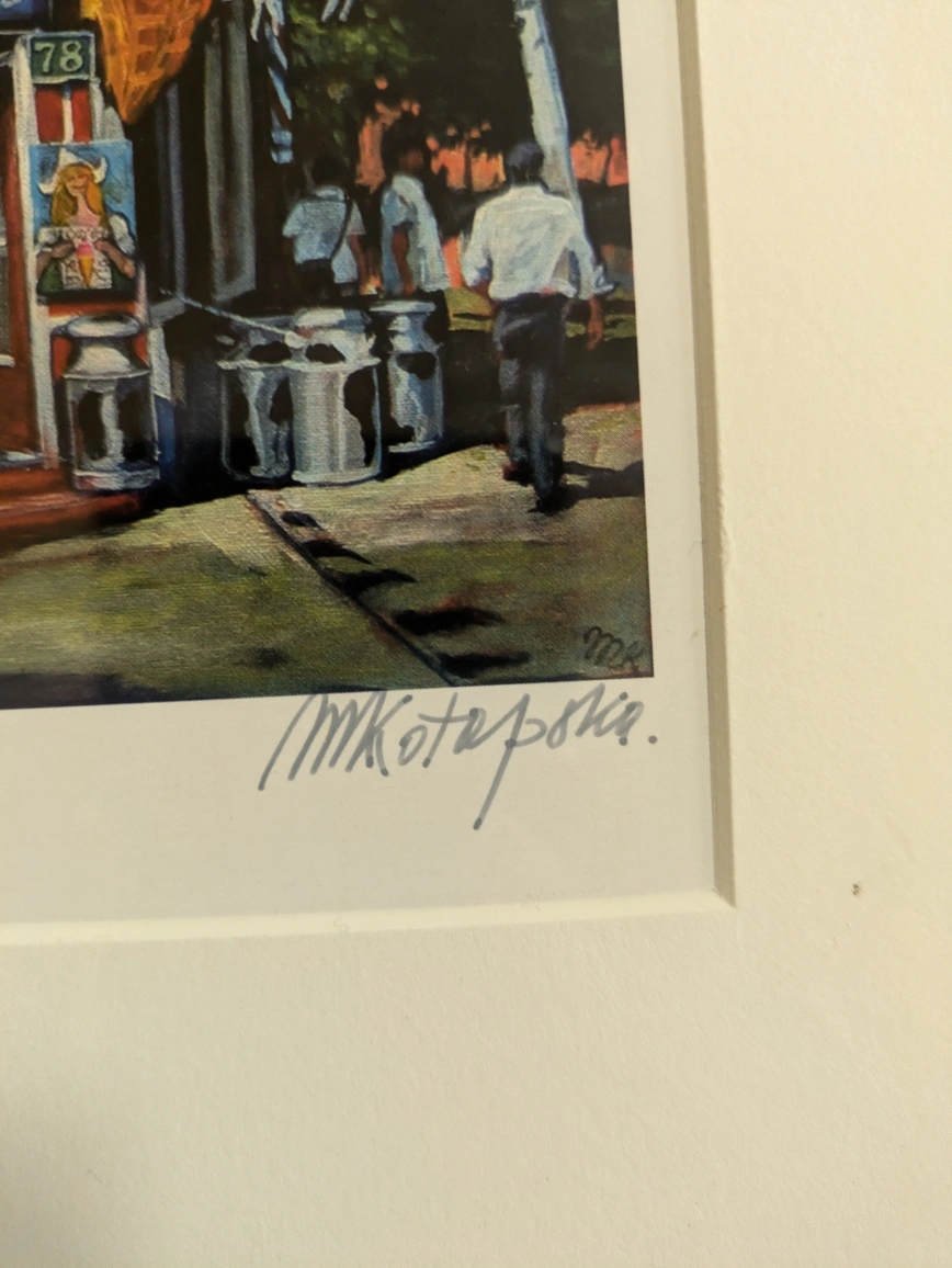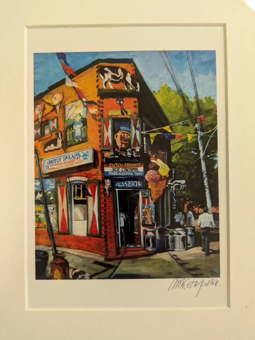 small framed print of "ice cream shop" by Marzena Kotapska depicting Dutch Dreams near Bathurst & St Clair. The art is 6x4.5 in a 13x11 frame appears to be signed by the artist