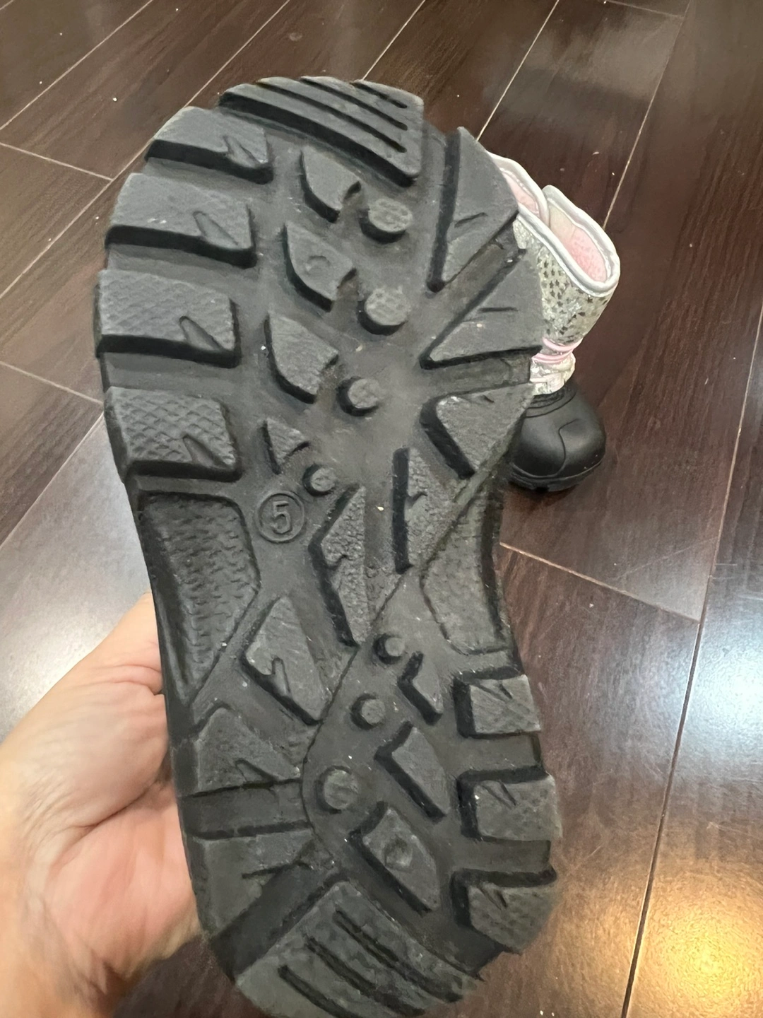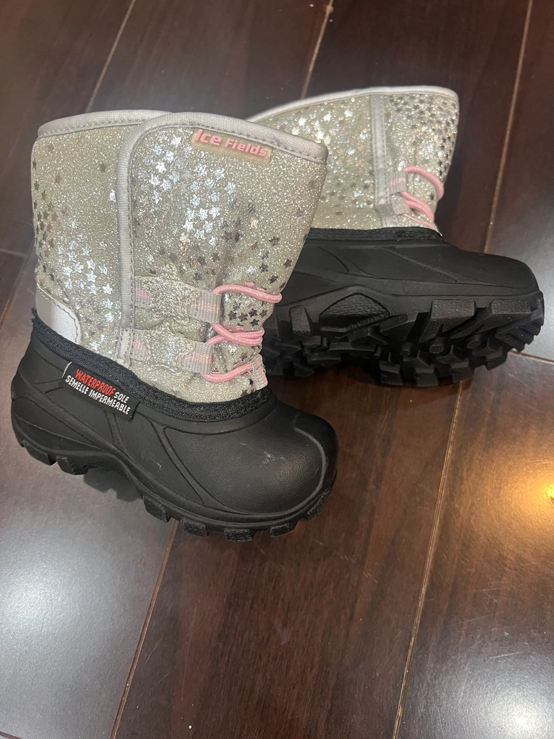 28Selling a pair of Ice Fields girls' winter boots in size 5. They feature a silver glittery design with pink accents and a black waterproof sole. Perfect for keeping little feet warm and dry during the winter months!