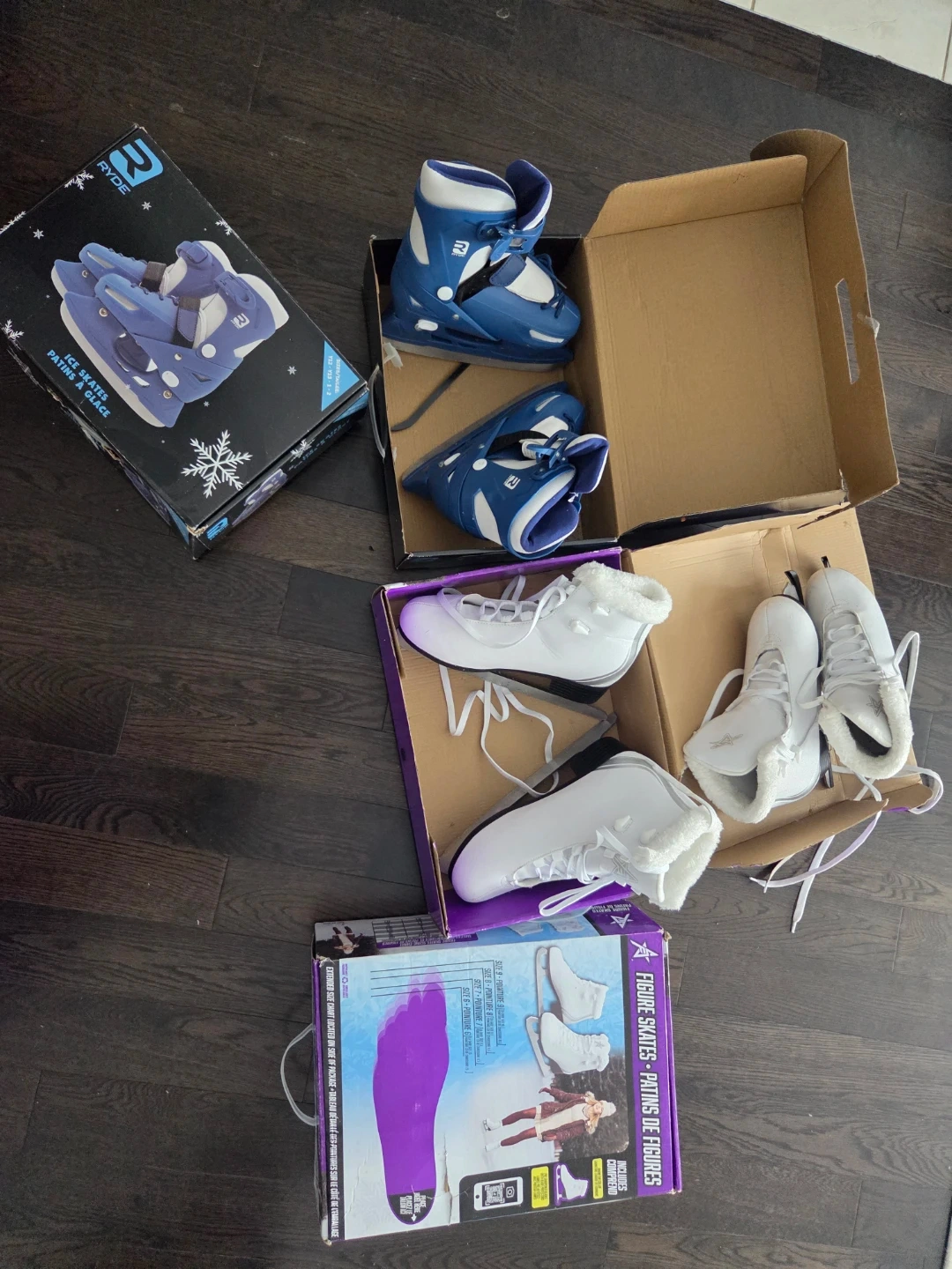 60Selling 5 pairs of ice skates. $20 each pair. Available sizes: Size 8 white for girls Size 8 white for girls Size 5 white for girls Size 3-6 blue for boys Size Y12-Y13, 1-2 blue for boys