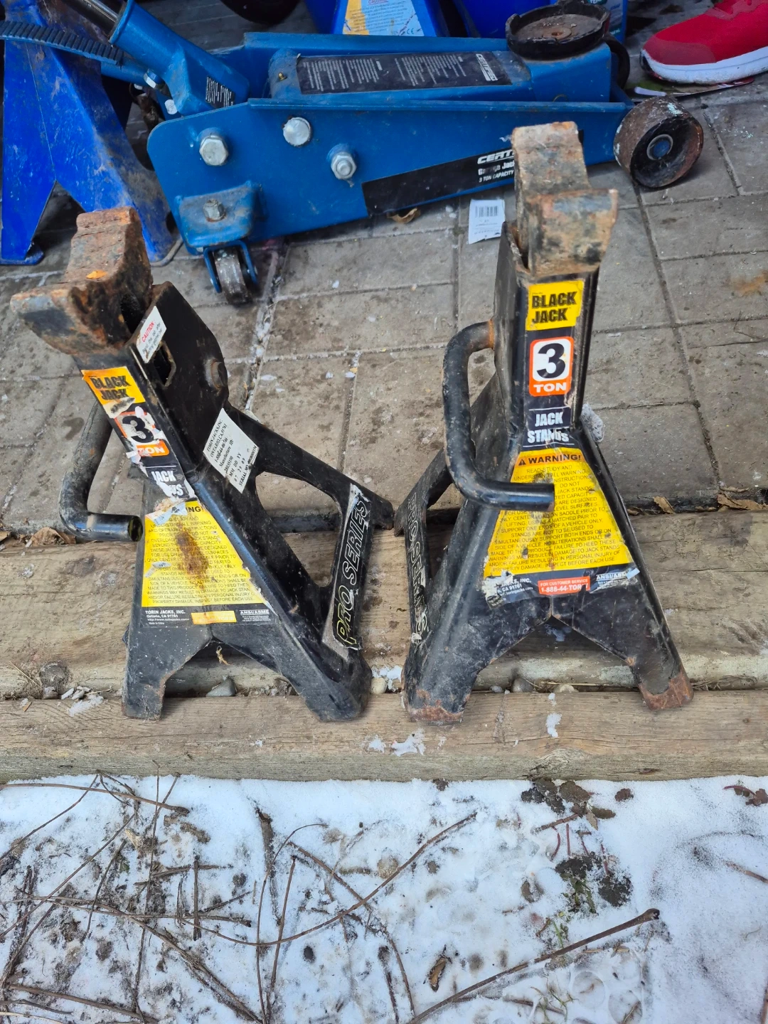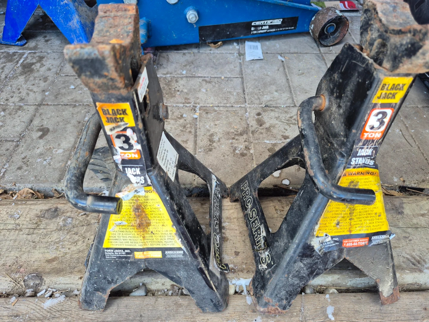 These are a pair of Black Jack 3-ton jack stands. They're made of sturdy steel construction for reliable support. Each stand has a capacity of 3 tons. These jack stands are essential for safely lifting and supporting vehicles during maintenance.