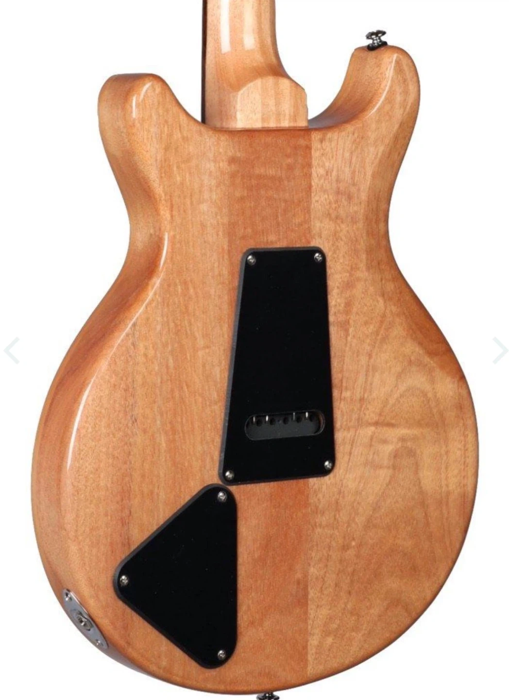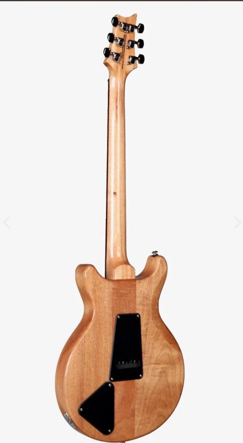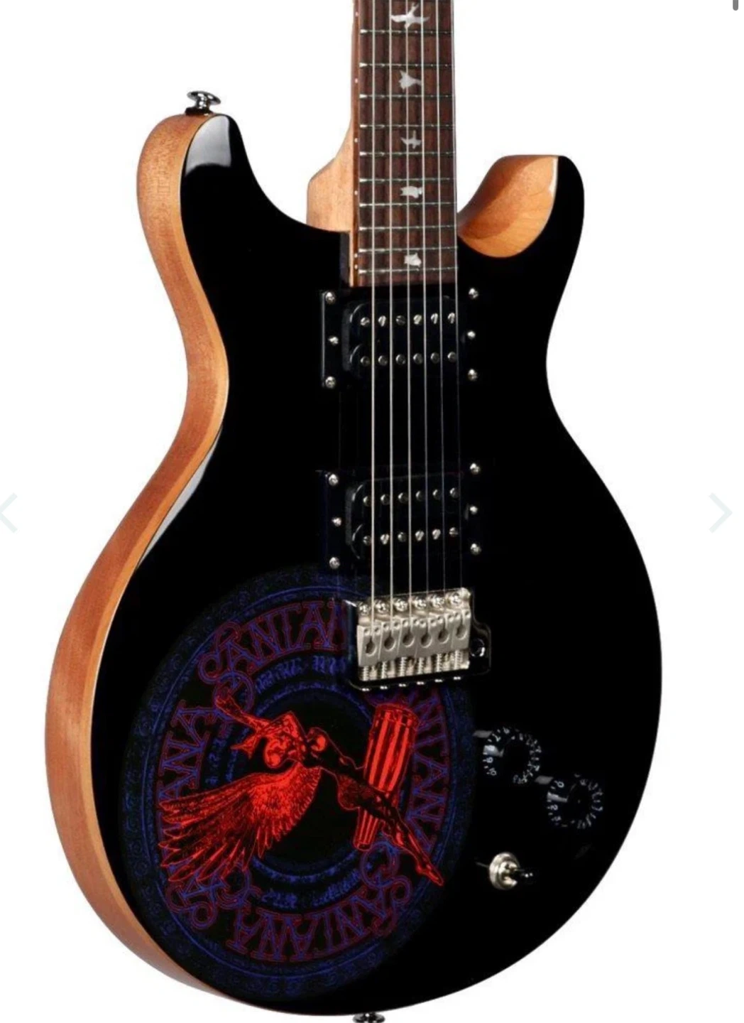 This is a PRS SE Carlos Santana electric guitar. It features a black finish with a custom graphic. The back of the guitar is natural wood.