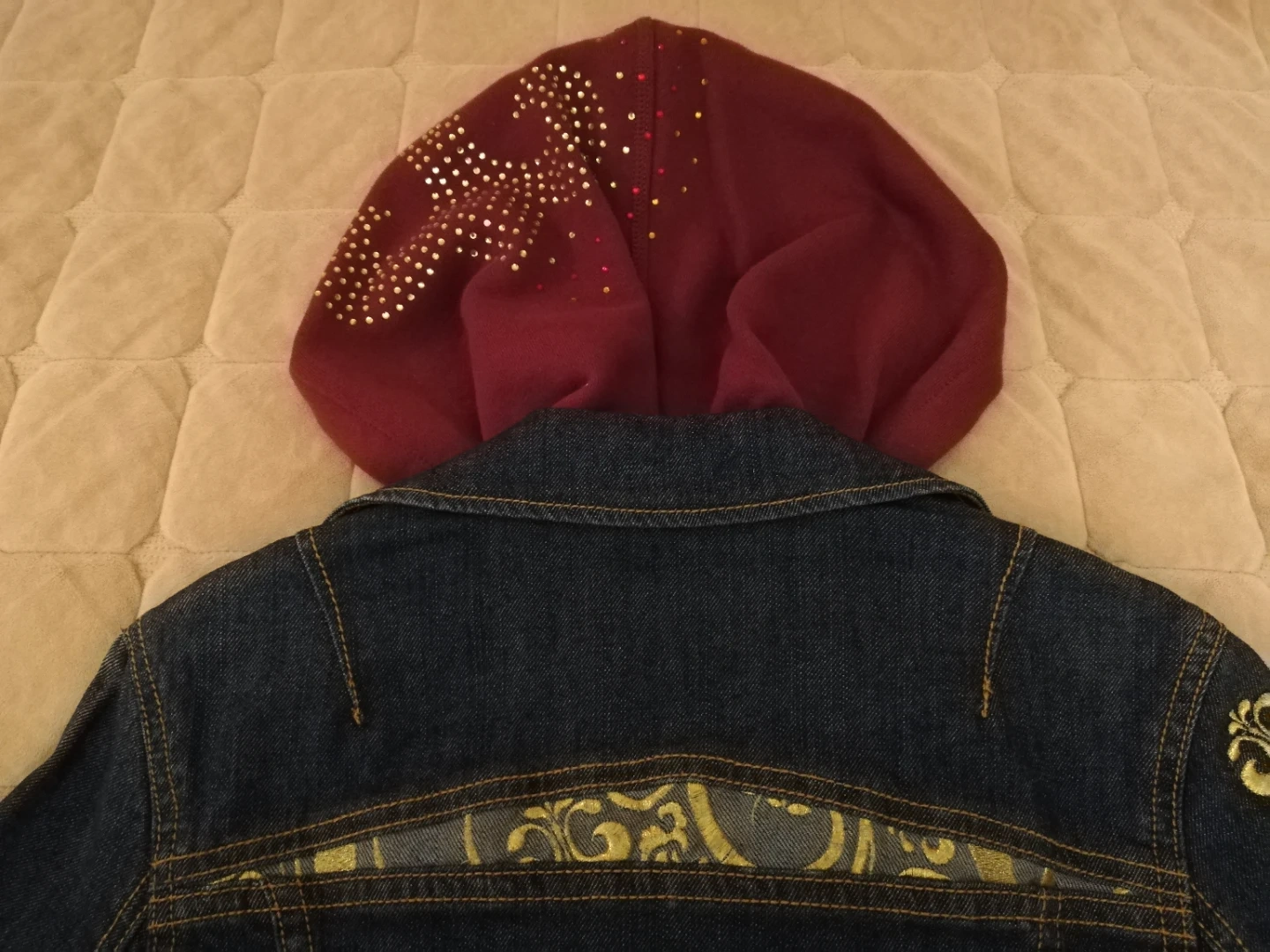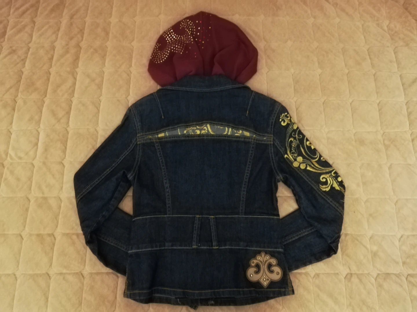 - Gold details on the right sleeve, fleur-de-lis design with rhinestones on the hood