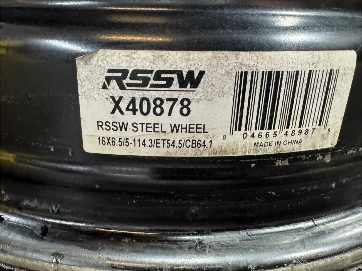 RSSW X40878 steel wheel. It's a 16x6.5 size with a 5x114.3 bolt pattern and a 64.1mm centre bore. Made in China. 215/55/R16