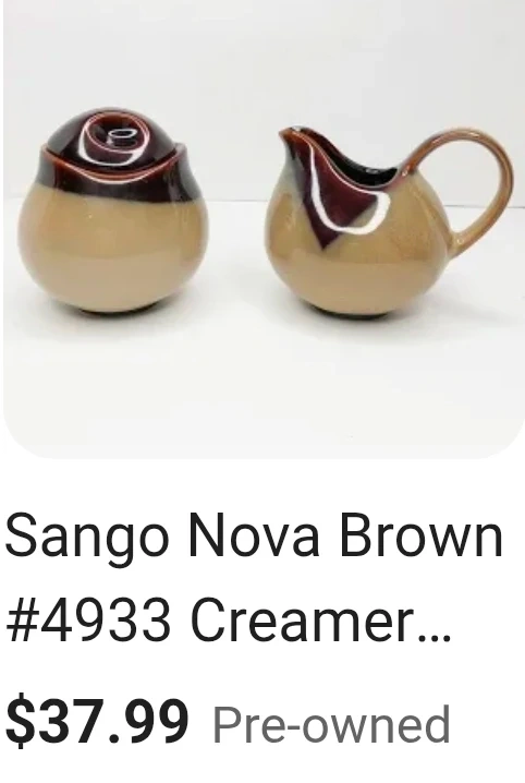 This is a Sango Nova Brown creamer and sugar bowl set. It's made of ceramic with a two-tone brown and beige glaze. The creamer has a handle and spout, and the sugar bowl includes a lid.
