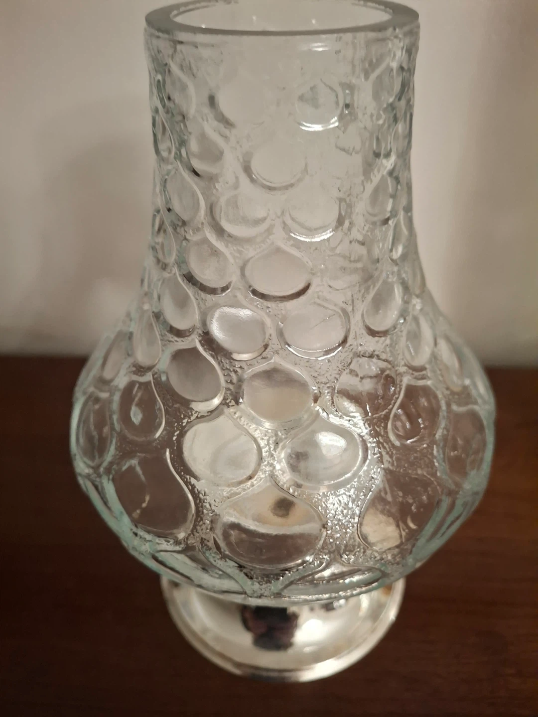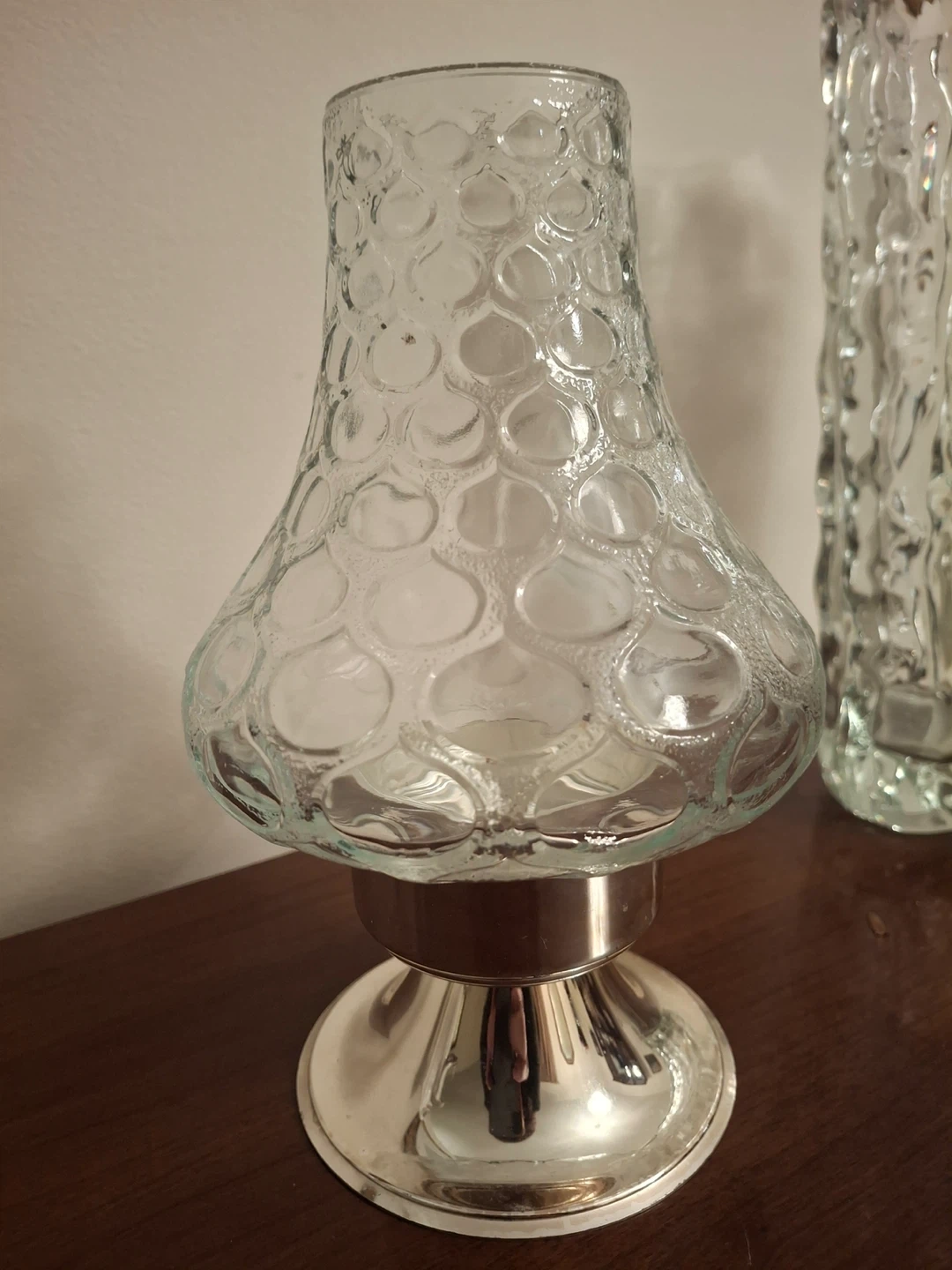 Heavy glass hurricane candle holder. Detail/texture on the glass. Base is silver plated and tarnish resistant. Made in Germany. 8” high, 4.5” at its widest. Quist brand, made in Germany.