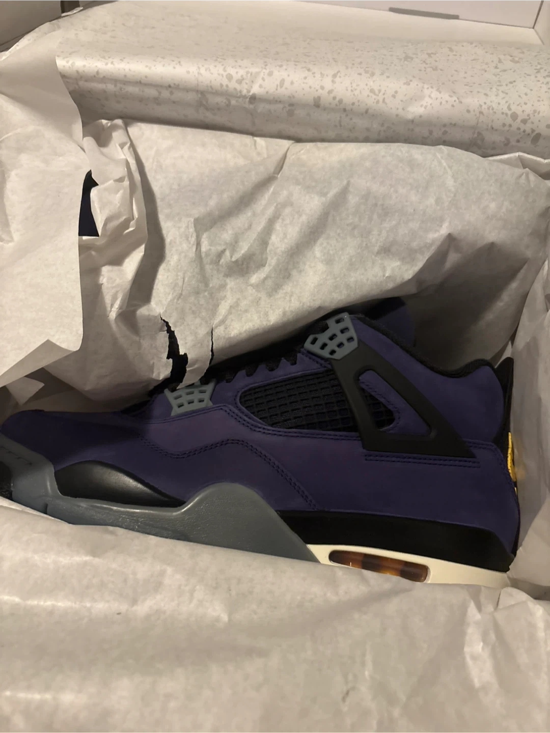 Brand new Air Jordan 4 'Lakeshow' sneakers, size 10.5 or 11. These kicks feature a rich purple suede upper with contrasting black and grey accents. The iconic Jumpman logo is prominently displayed on the tongue. Comes in original box.