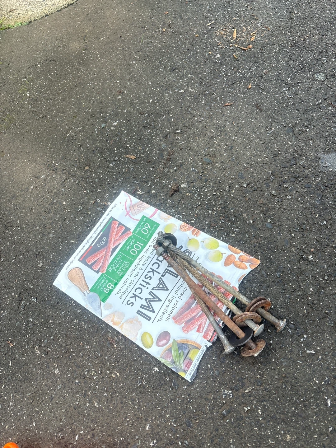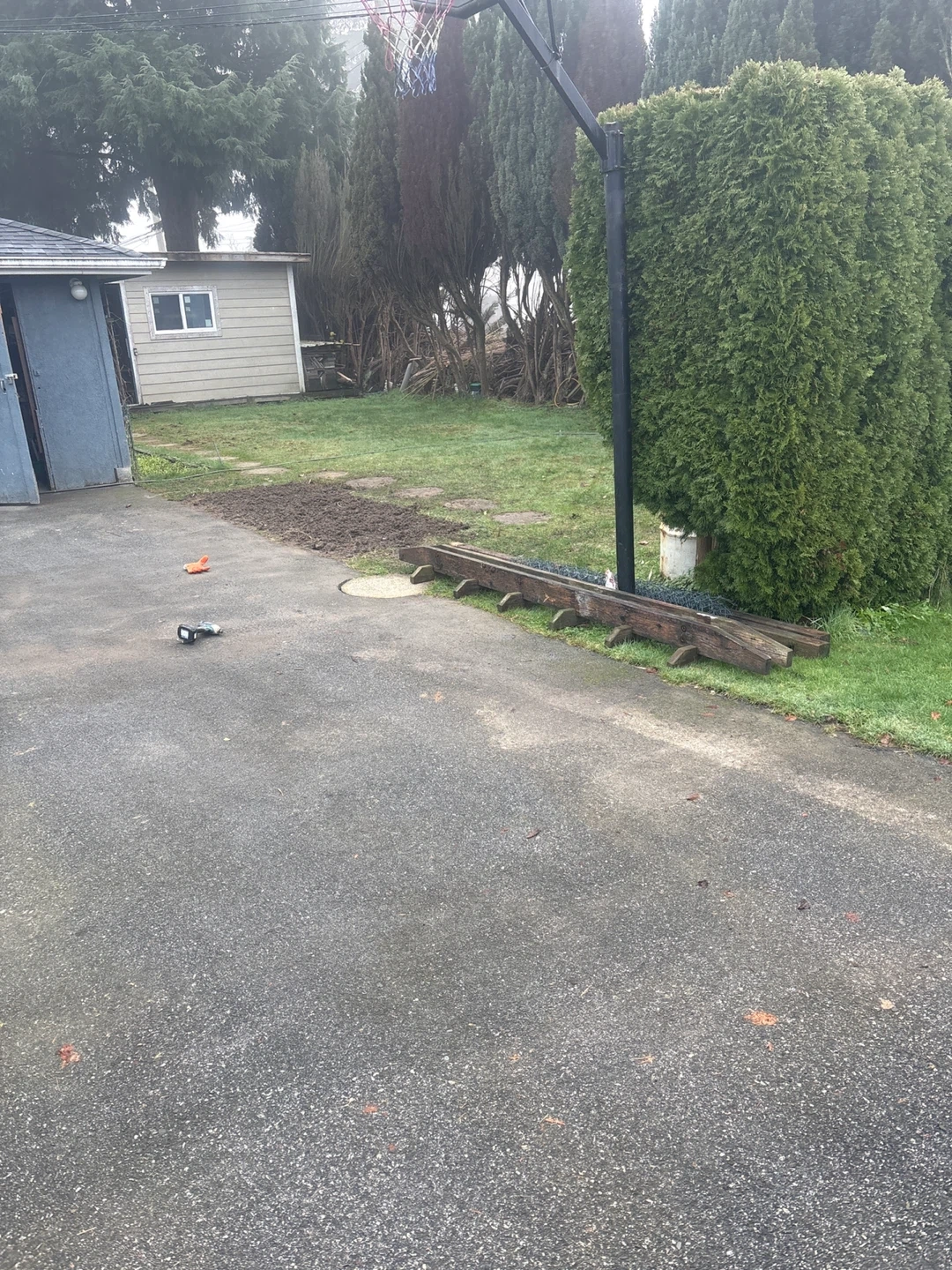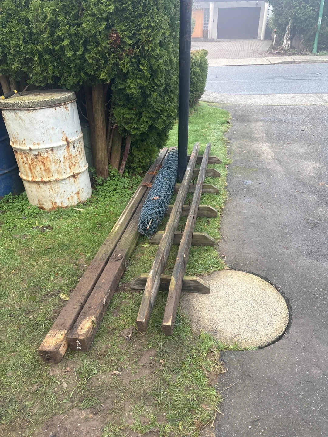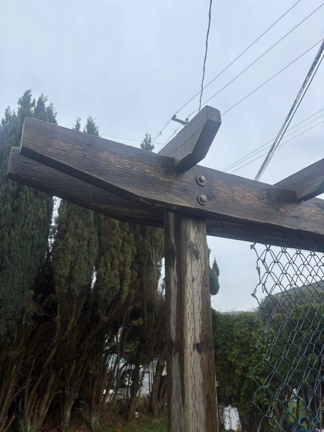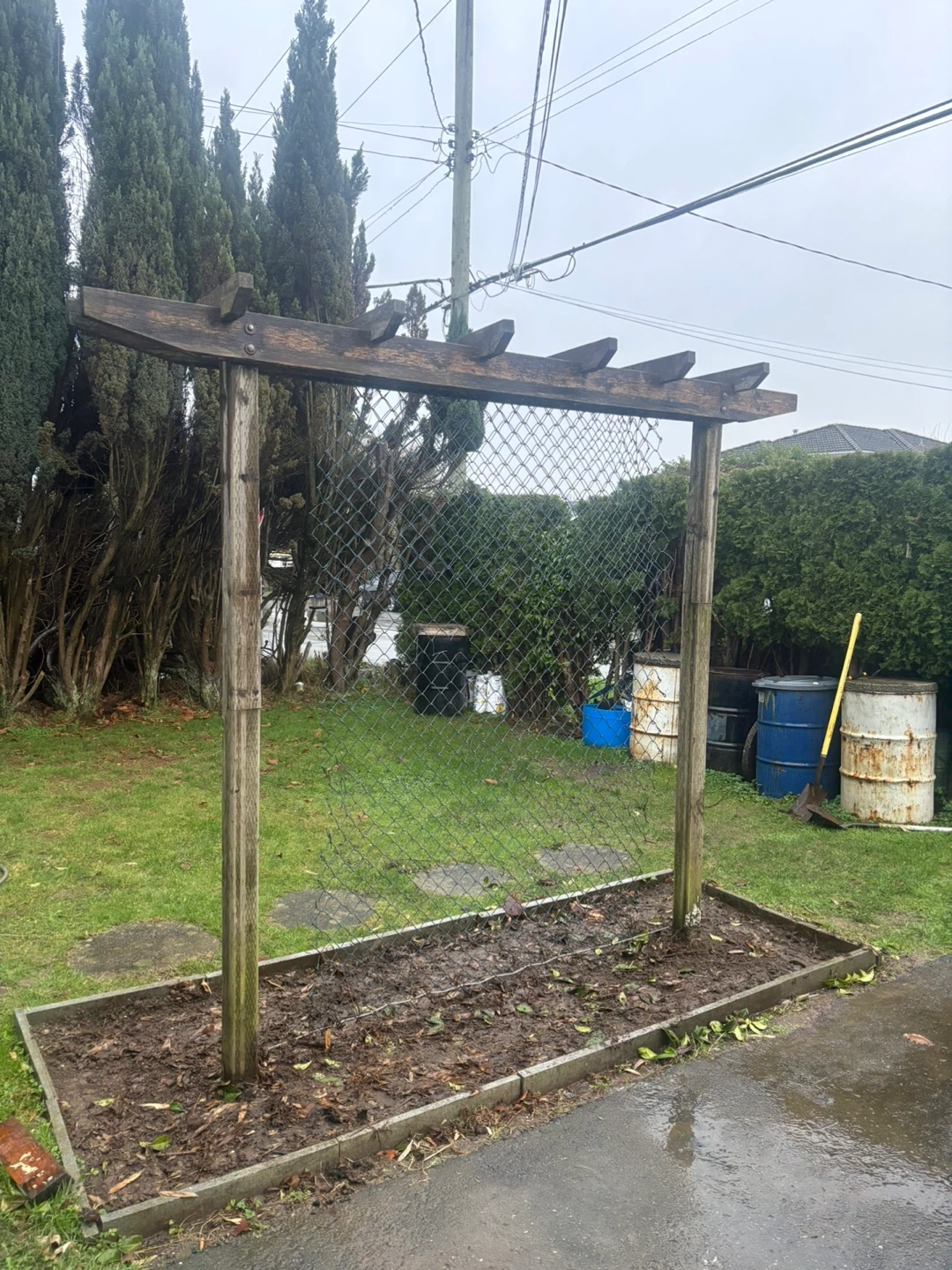 This is a wooden pergola frame, likely for a garden or walkway. It's constructed from weathered wood posts and beams. Included is a roll of chain link fencing that can be attached as a screen or for climbing plants. This would be great for adding some structure and privacy to your outdoor space.