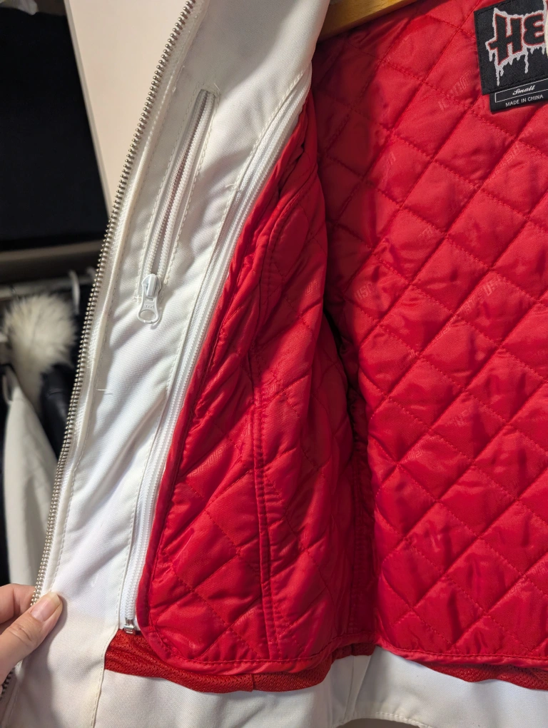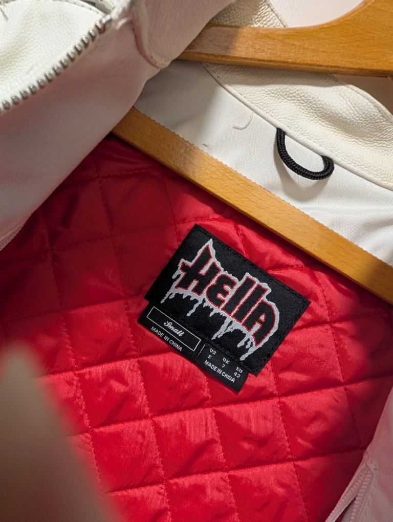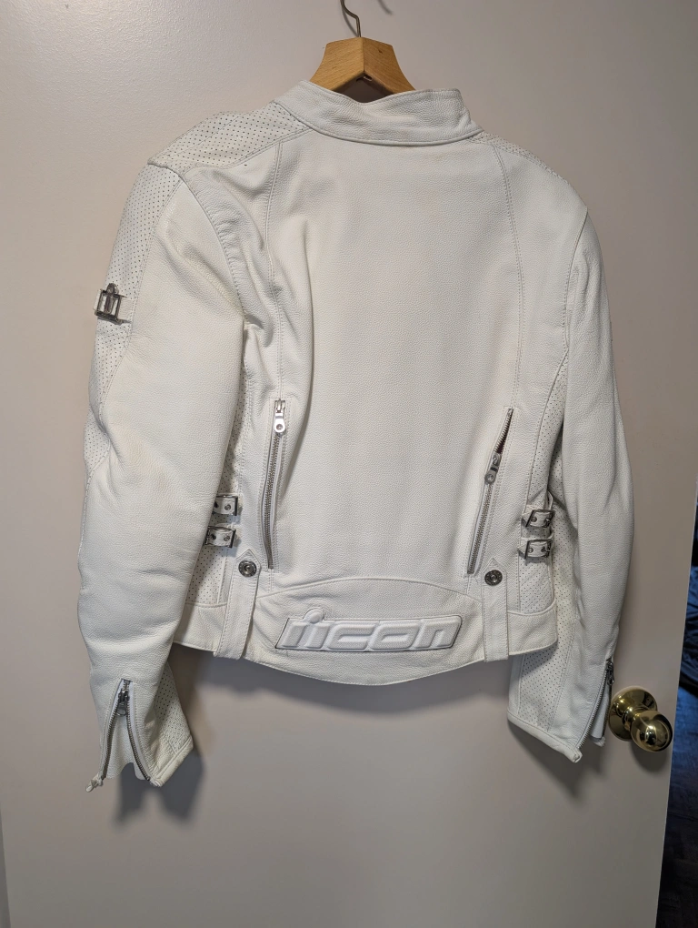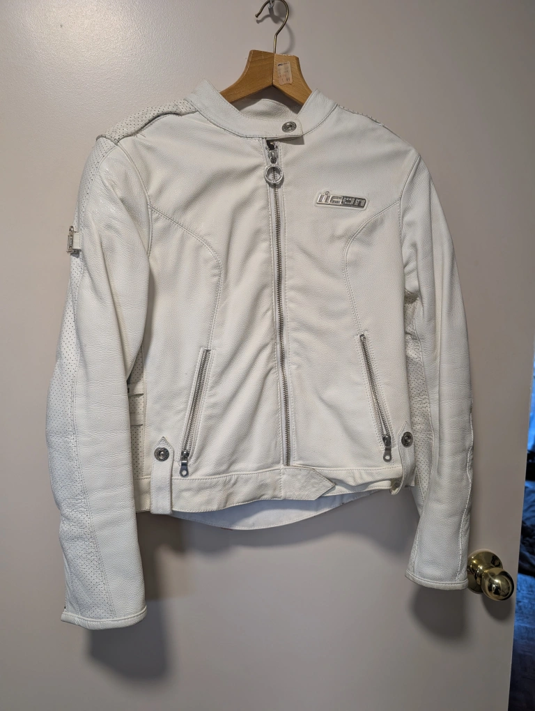 20Selling a women's Icon Hella leather motorcycle jacket in a size small! It's white on the outside with a red quilted lining. Great for riding in style and comfort