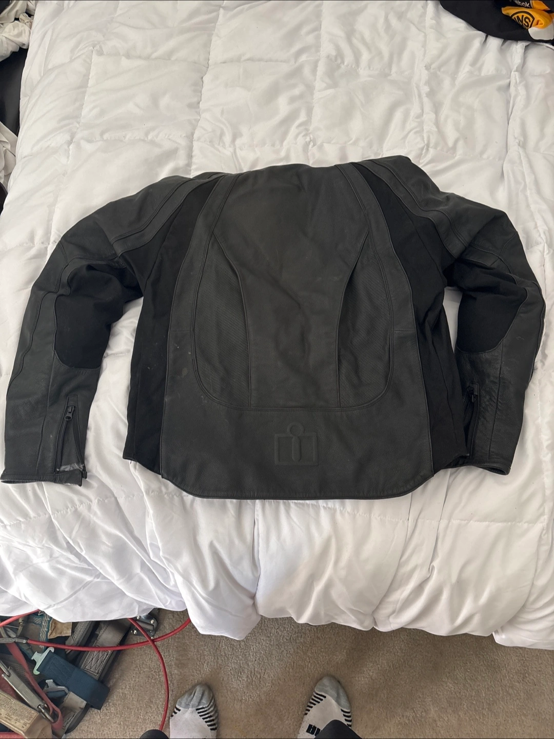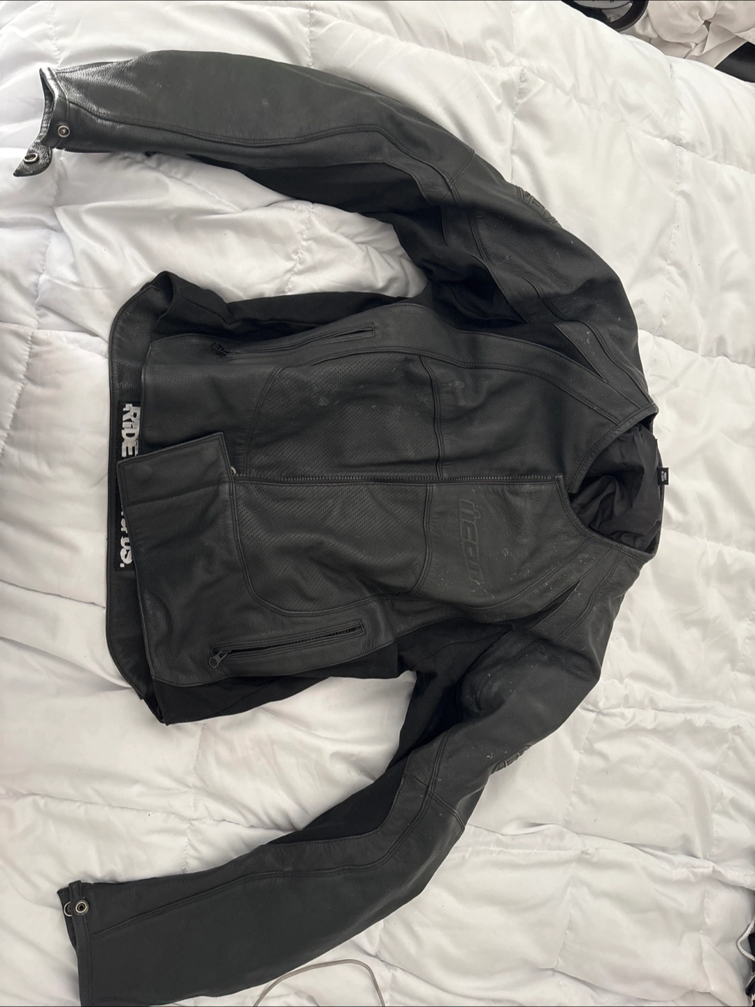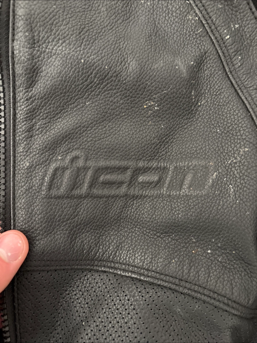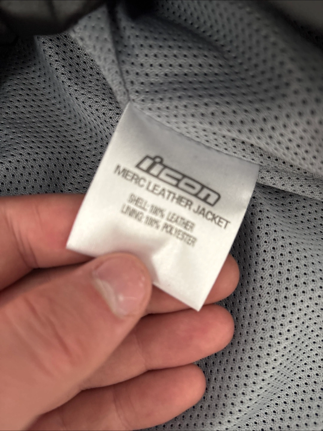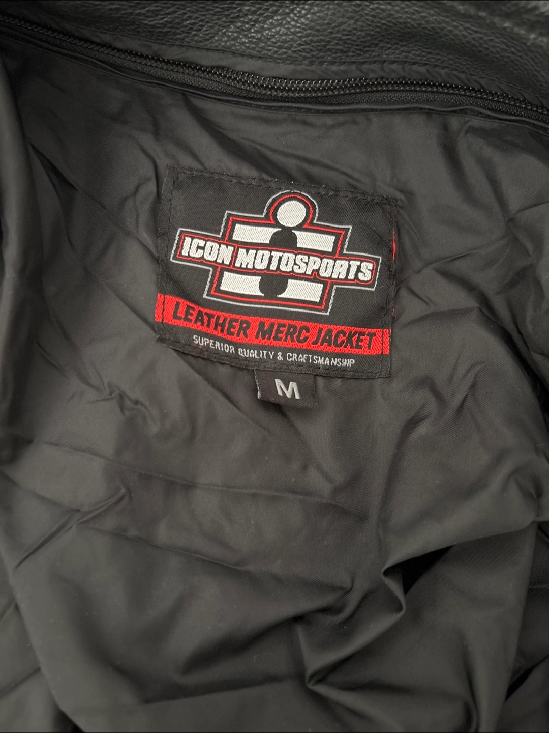 33Selling an Icon Merc leather jacket. It's a size medium and made with 100% leather shell and 100% polyester lining. Has a 'Ride Among Us' patch on it.