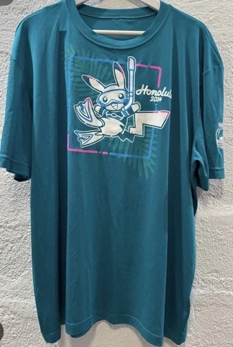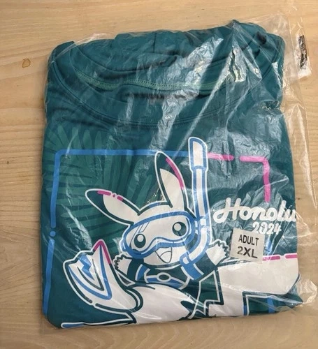 Men's XXL Competitor T-shirt, an official merchandise piece from the 2024 Worlds Honolulu Hawaii collection. Featuring the beloved Pikachu character, this teal shirt is a vibrant addition to any fan's wardrobe. The relaxed fit ensures a comfortable experience for all-day wear, making it an ideal choice for both casual outings and Pokémon-related events.