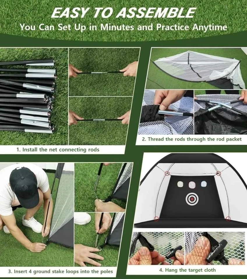 Our golf net is easy to set up and take down within 2-5 minutes. Easy setup Golf Hitting Net would save your precious personal time much better so that there is more time to enjoy Golf Game Indoor or Outdoor! You can set a golf net up easily anywhere, indoor or outside, in the living room, backyard, or basement(Please refer to the manual for specific operations). A small carry bag is filled with all the accessories, saving space and easy to carry.