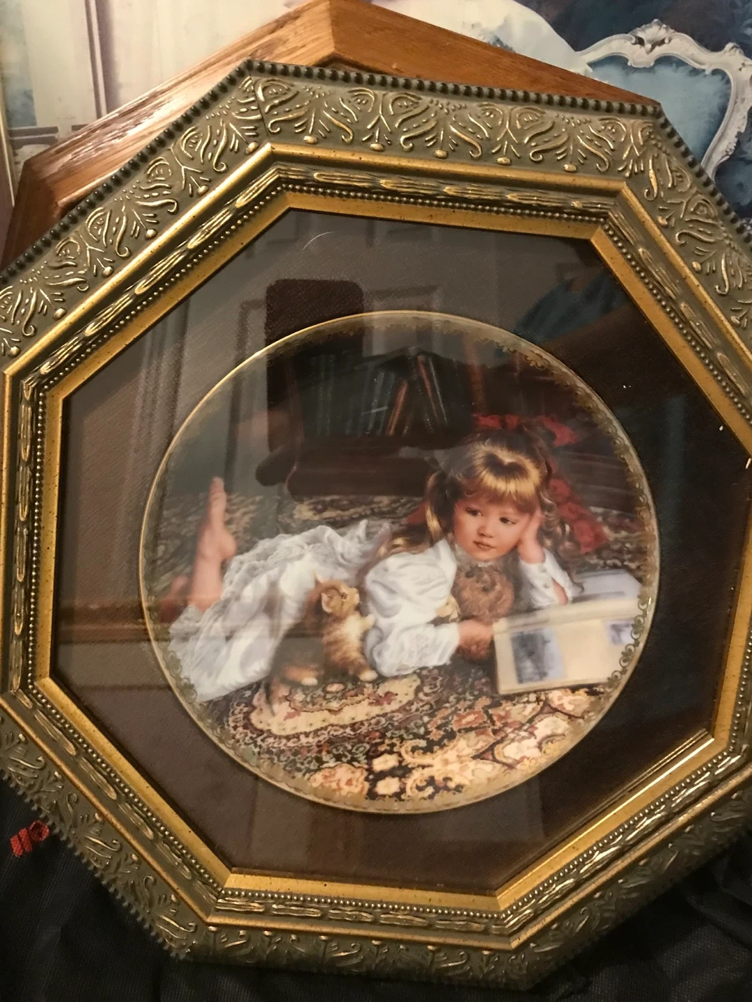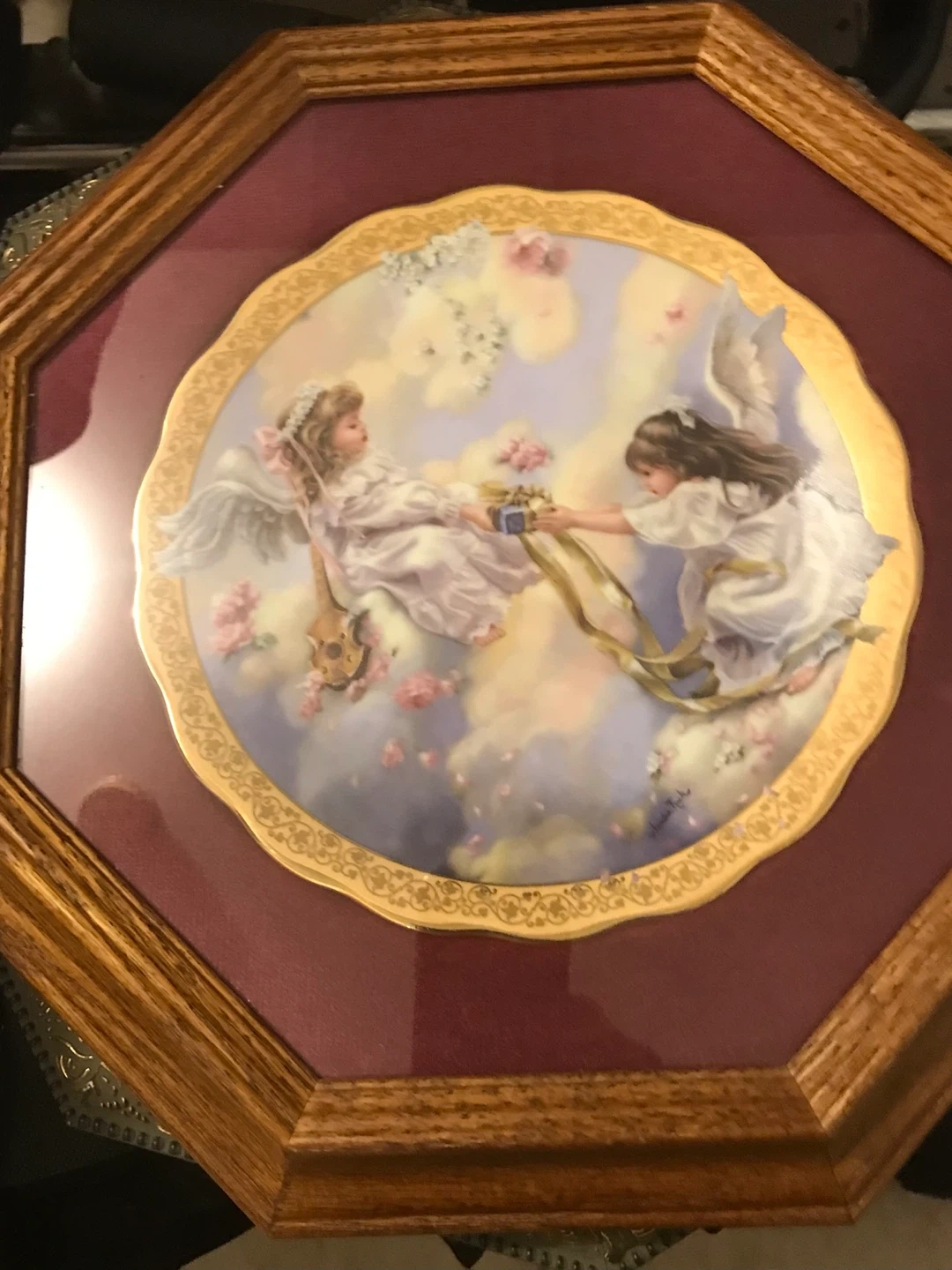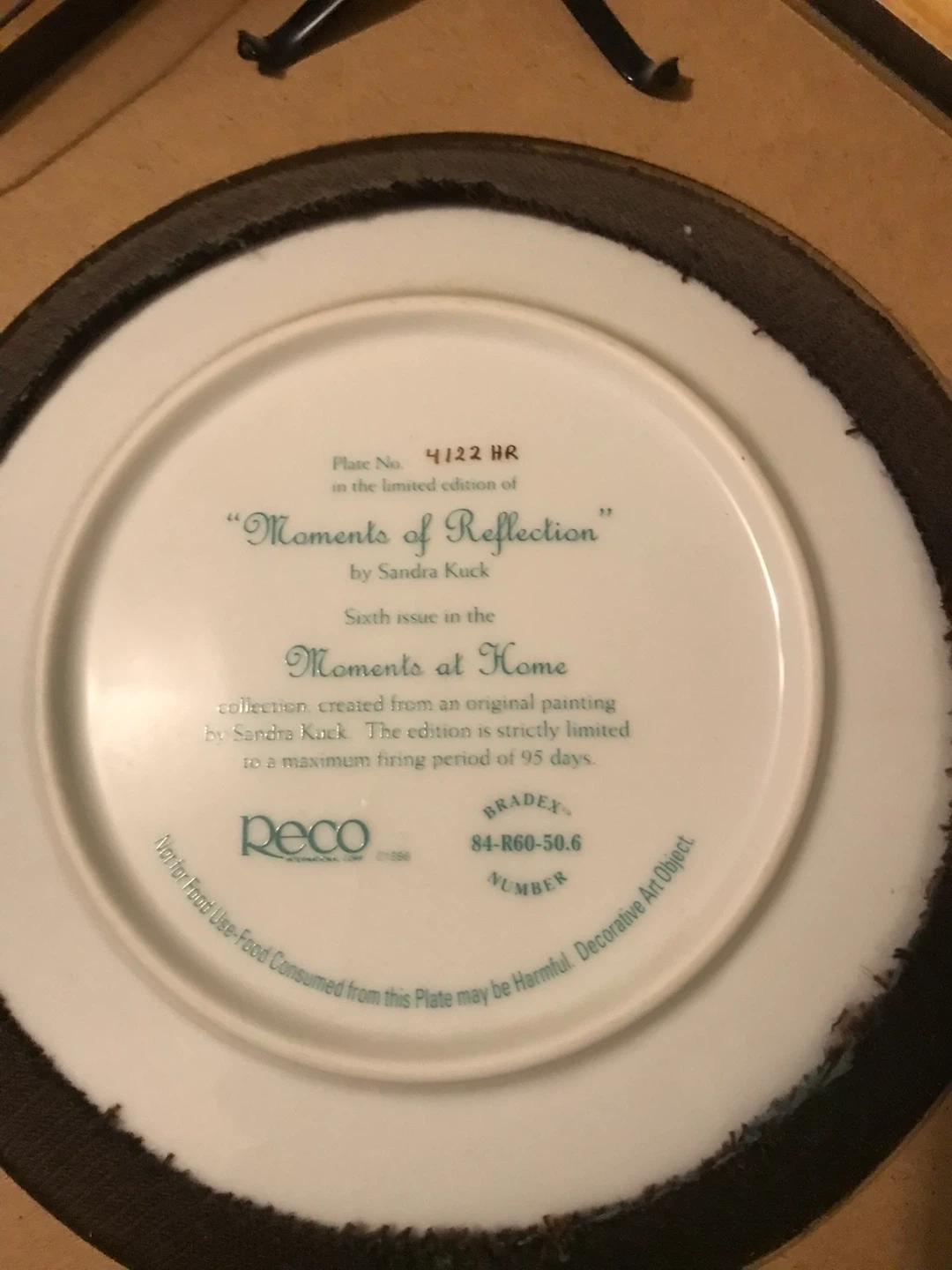 Two limited edition decorative plates by Sandra Kuck, "Gently Giving" and "Moments of Reflection". Both are collectible art objects with wooden frames. They were produced by Peco, with "Gently Giving" being the third issue in Sandra Kuck's Gardens of Innocence collection, and "Moments of Reflection" the sixth issue in Moments at Home. These plates are for decorative use only.
