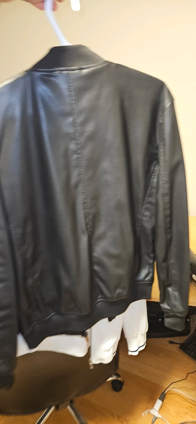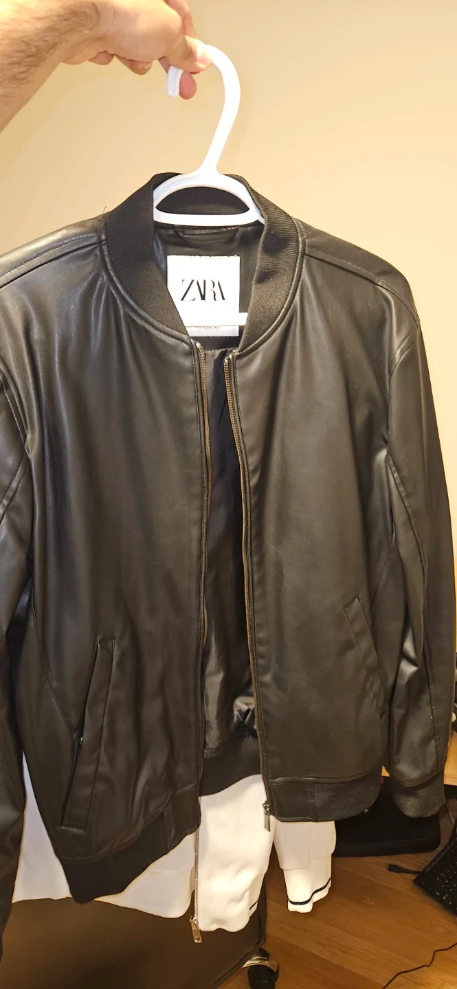 Black faux leather bomber jacket from Zara. It's a size small with a full zip closure. This jacket is lightweight and stylish! It's in perfect condition, barely worn.