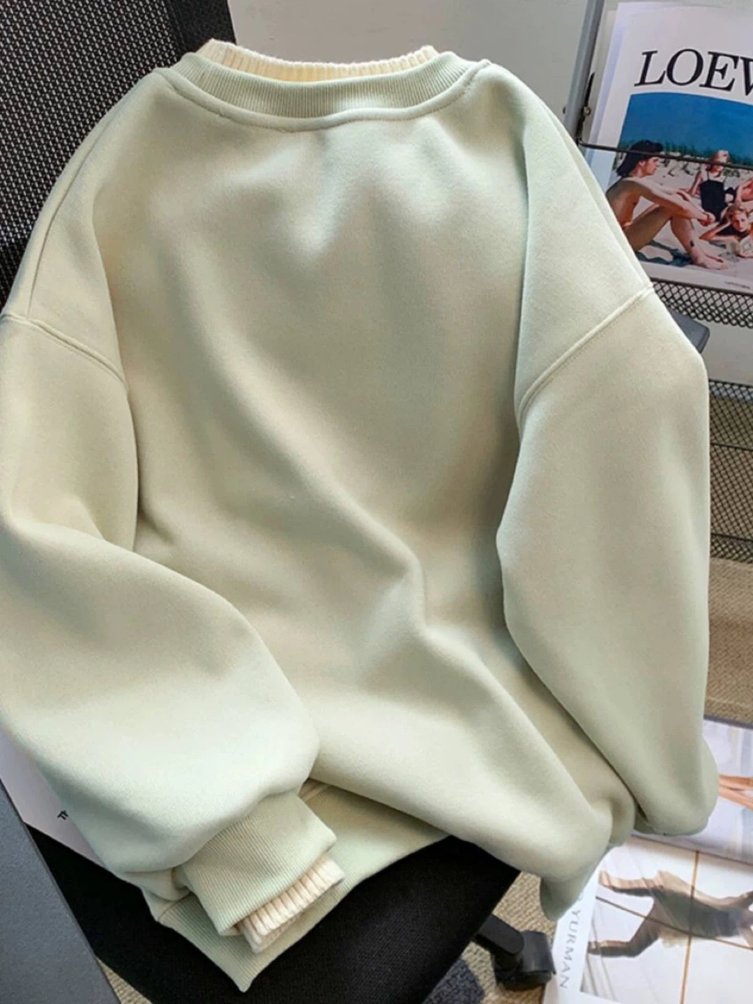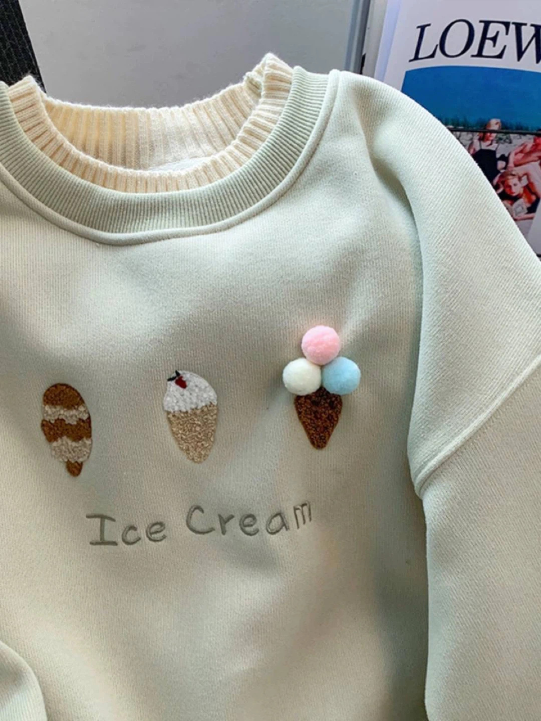 This light green crewneck sweater features cute embroidered ice cream cones and the text 'Ice Cream'. It's super cozy with a ribbed collar, cuffs, and hem. Great for a casual, fun look!
