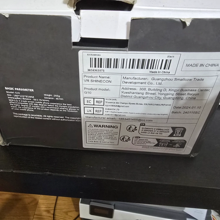 Virtual reality glasses. Model G10. Lightweight design. Compatible with smartphones. Includes box and packaging.