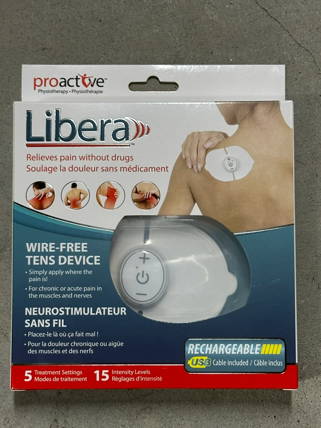 This Proactive Libera wire-free TENS device relieves pain without drugs. It has 5 treatment modes and 15 intensity levels. The device is rechargeable and includes a USB cable, gel pad, and a carrying case with instructions.