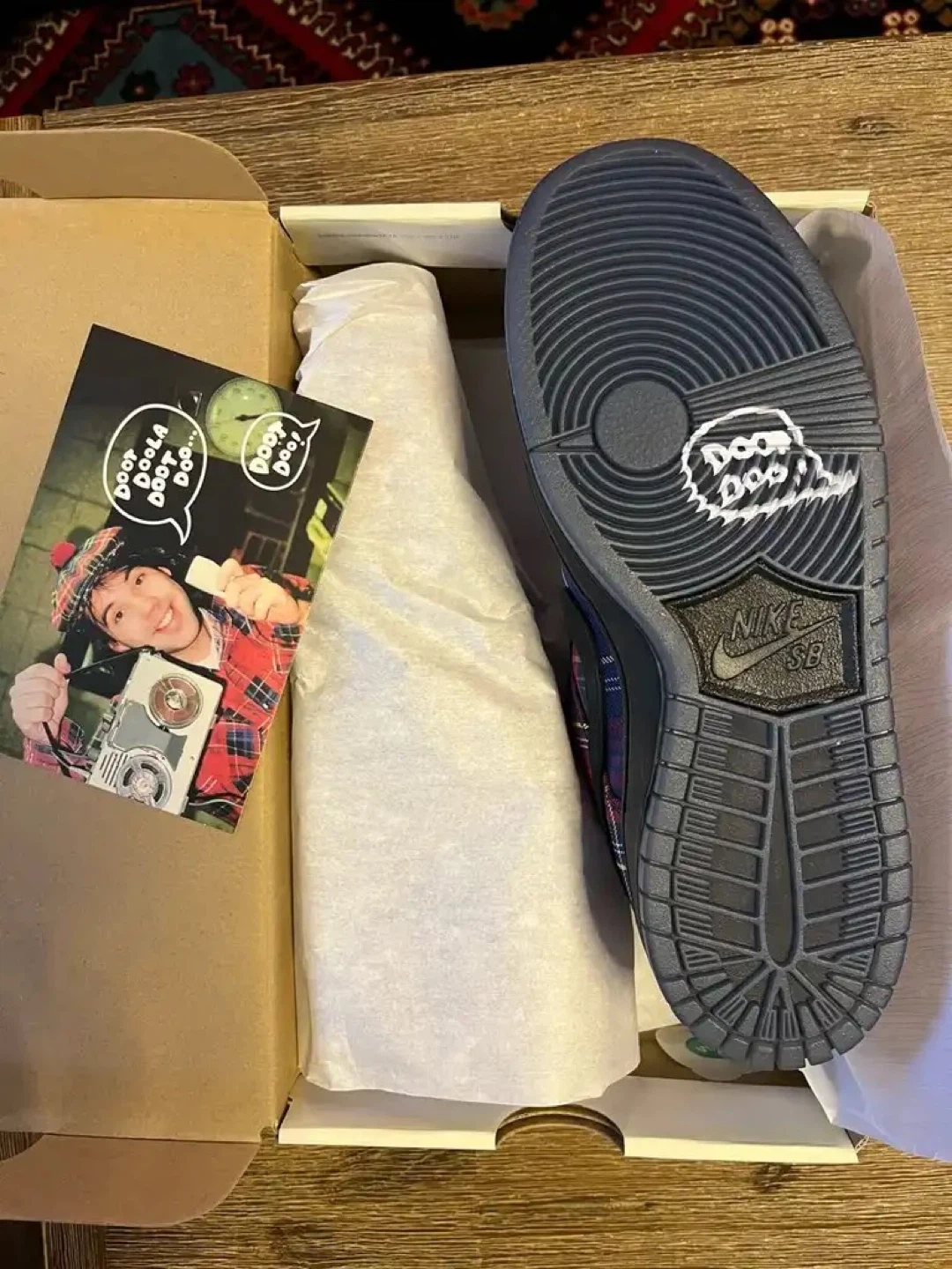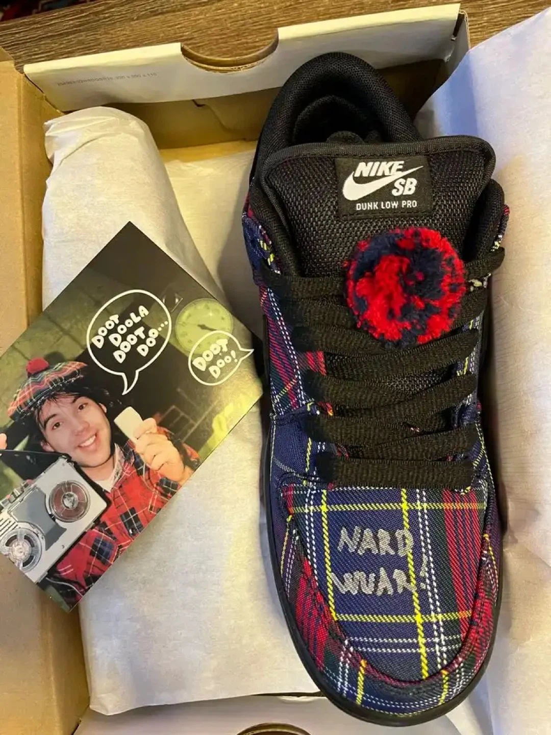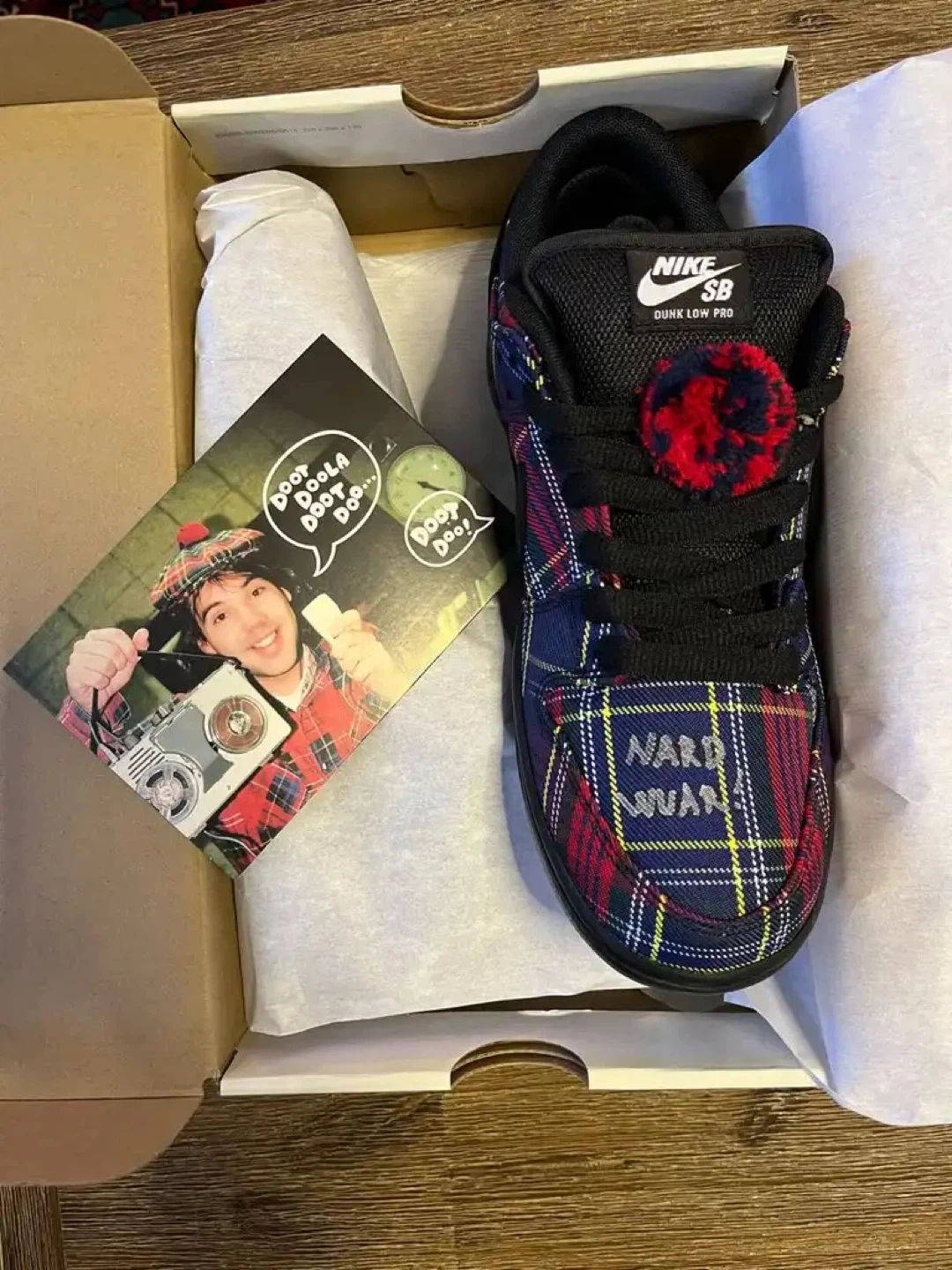 Serious Nike Sb Collectors this is the one up for grabs is an insanely rare pair of Nike Sb Dunk Low “Nardwuar” in Brandnew Condition, complete with original box, packaging, and the exclusive Nardwuar post card insert. One of the most unique and hardest to find Sb collabs of the era and this pair is even more special.
