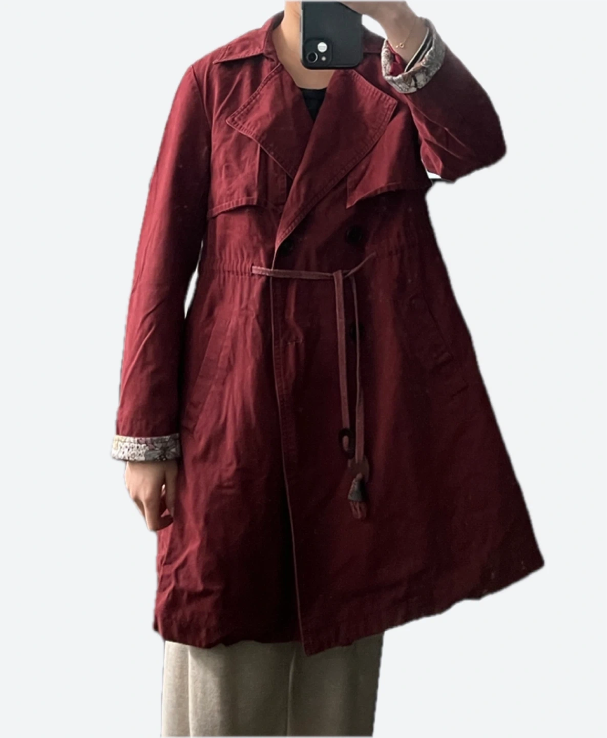 60A stylish red trench coat! It features a unique floral lining and a flattering silhouette. Perfect for adding a pop of colour to your wardrobe!