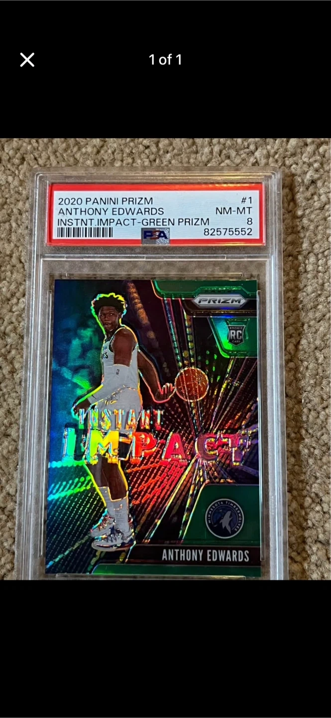 This is a 2020 Panini Prizm trading card featuring Anthony Edwards. It's a Green Prizm variation from the Instant Impact set. The card is graded NM-MT.