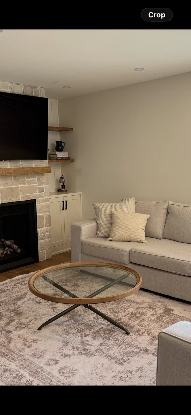 This round coffee table features a glass top with a wood and metal base. In good condition, minor scratches on the glass