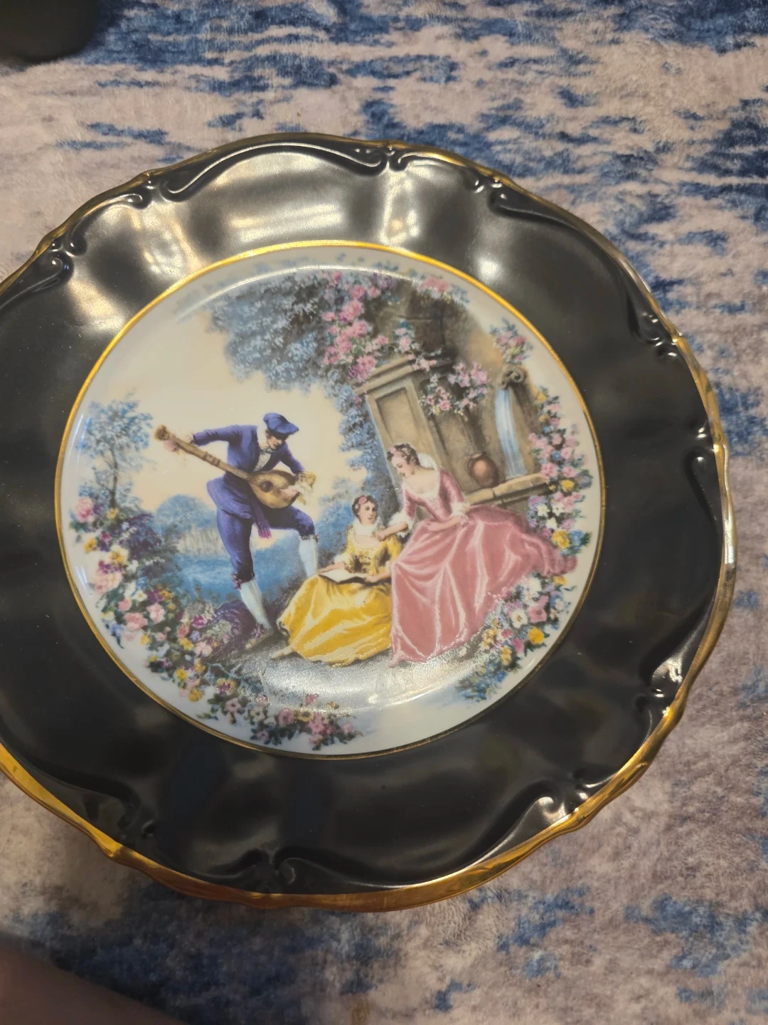 This decorative plate features a vibrant scene of a couple in a garden setting, with a man playing a lute. It has a black rim and a gold-colored trim. The plate is ideal for display or as a decorative accent piece in your home.