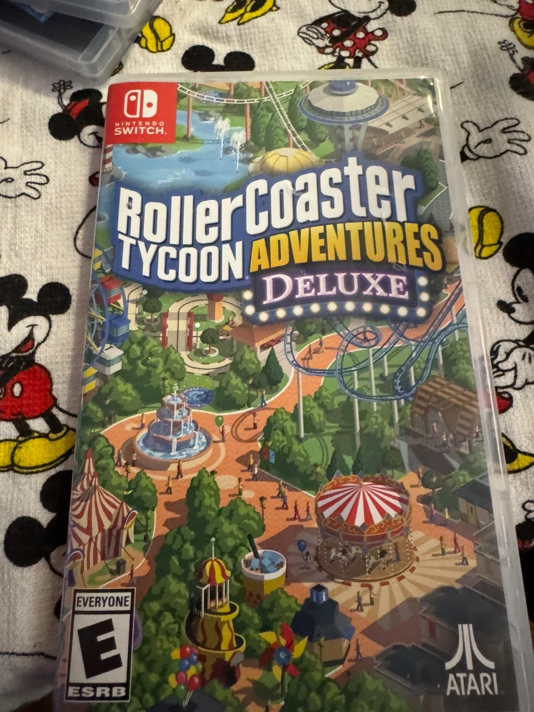 This game is RollerCoaster Tycoon Adventures Deluxe for the Nintendo Switch. It includes the game cartridge. The game is rated E for Everyone.