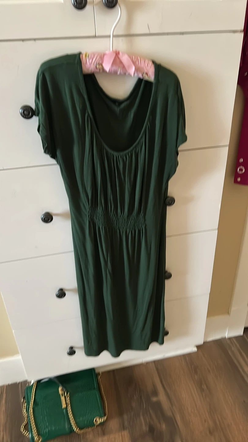 This is a dark green midi dress with a ruched waist detail. It has short sleeves and a scoop neckline. The fabric appears to be a soft, stretchy material. It's a versatile piece suitable for many occasions.