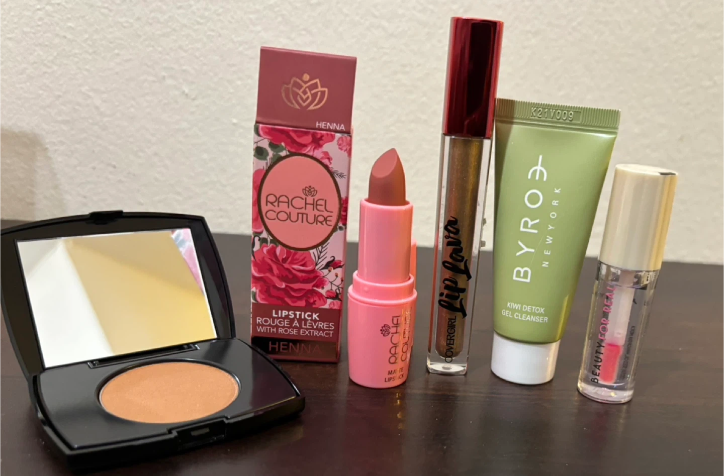This set includes a Rachel Couture matte lipstick with rose extract, a Covergirl Lip Lava gloss, and a Byroe New York Kiwi Detox gel cleanser. It also contains a compact with blush or bronzer and a lip gloss. Great for makeup enthusiasts!