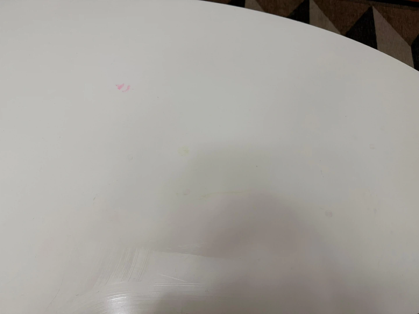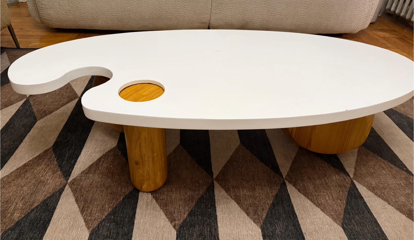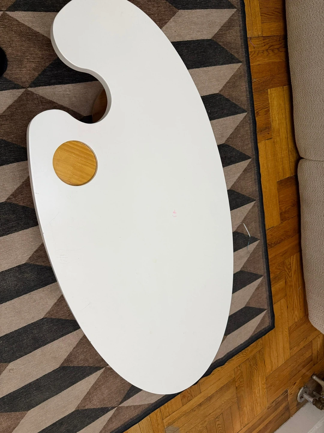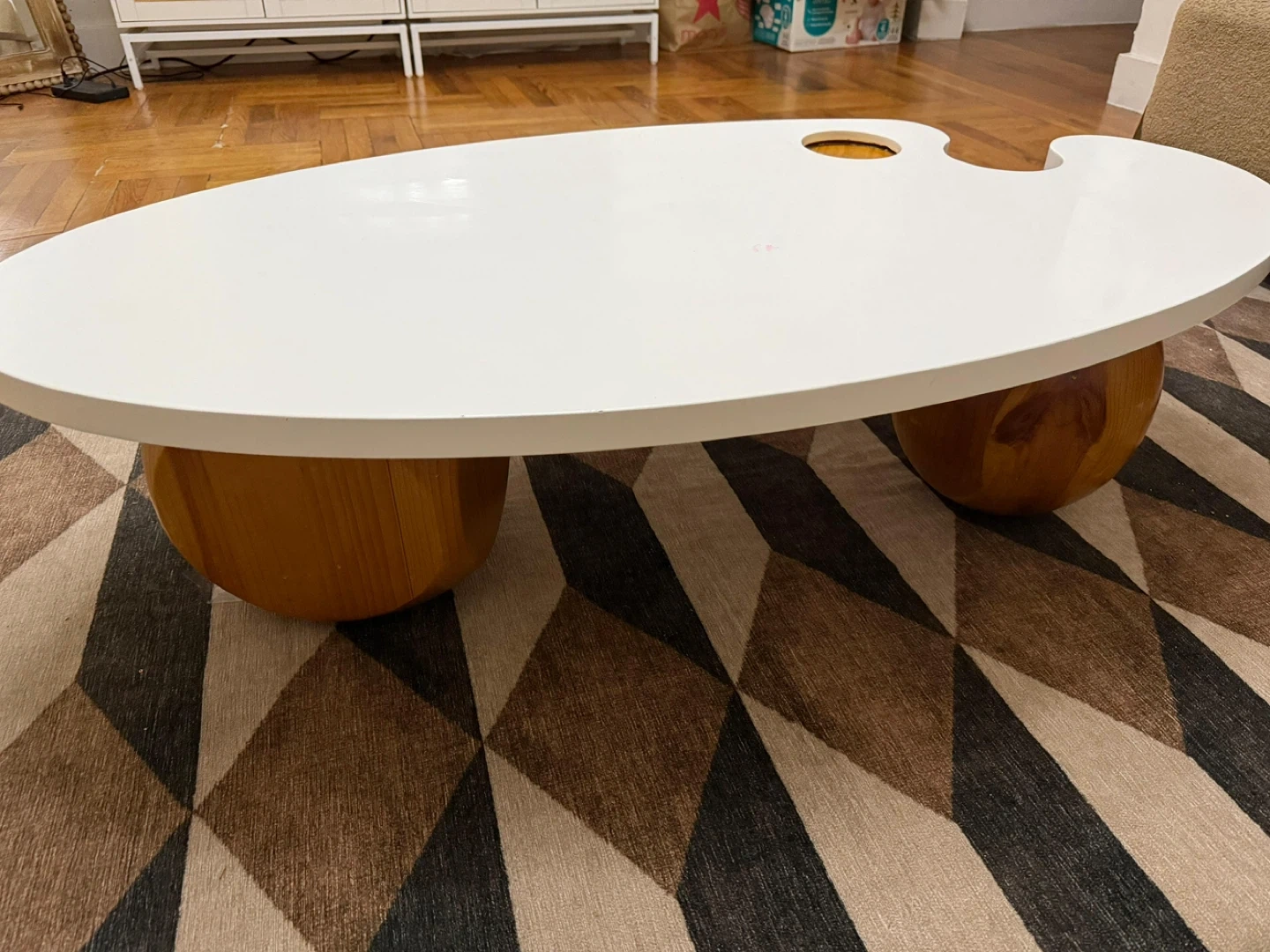 This eye-catching coffee table features a white, artist's palette-shaped top with a built-in wooden accent. It's supported by distinctive rounded wooden legs, adding a modern, sculptural element to your living space.