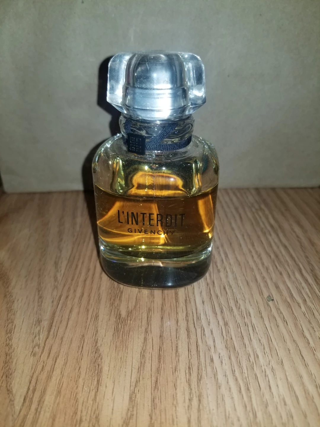 This is a bottle of Givenchy L'Interdit Eau de Parfum. It's a floral woody musk fragrance. The perfume comes in a clear glass bottle with a silver cap and black ribbon detail.
