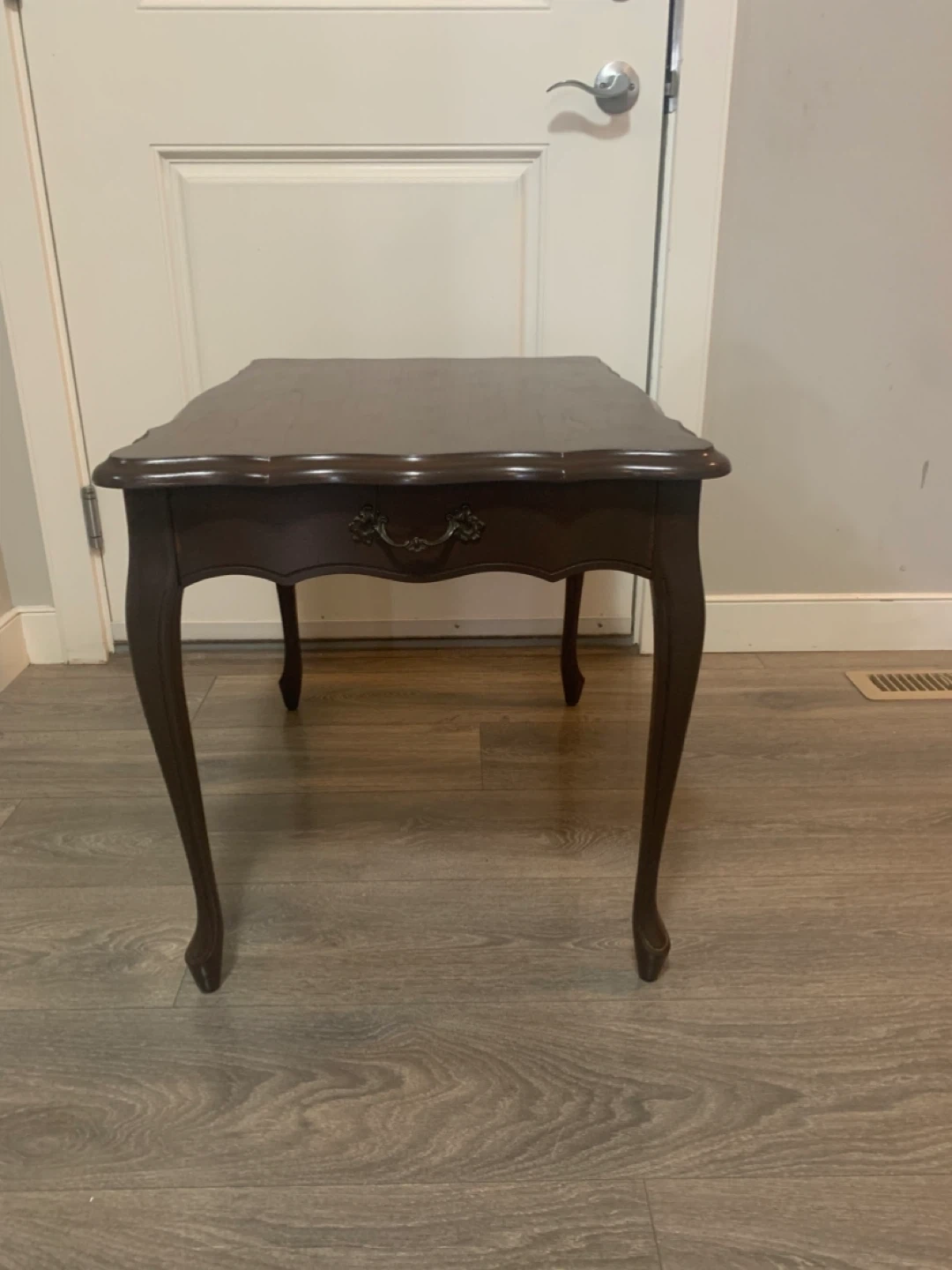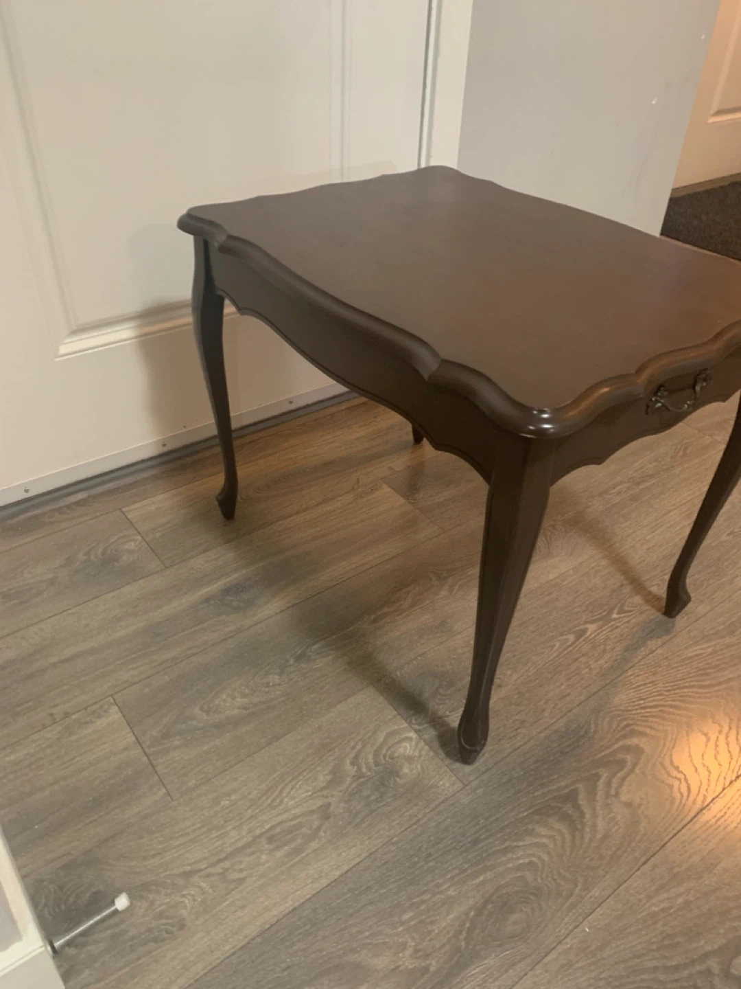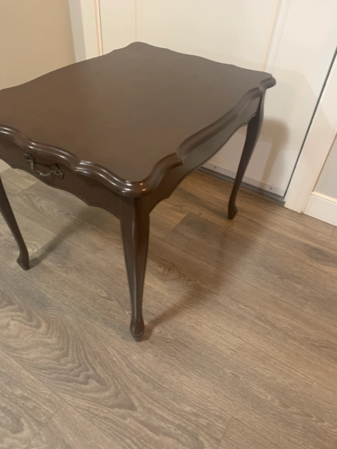 This vintage-style side table features a dark brown finish and elegant curved legs, making it a charming addition to any room. It is still sturdy and functional. It's perfect for holding lamps, books, or your favourite cup of tea. I think it's lovely, I hope you do too! If the ad's still up, it's still available!