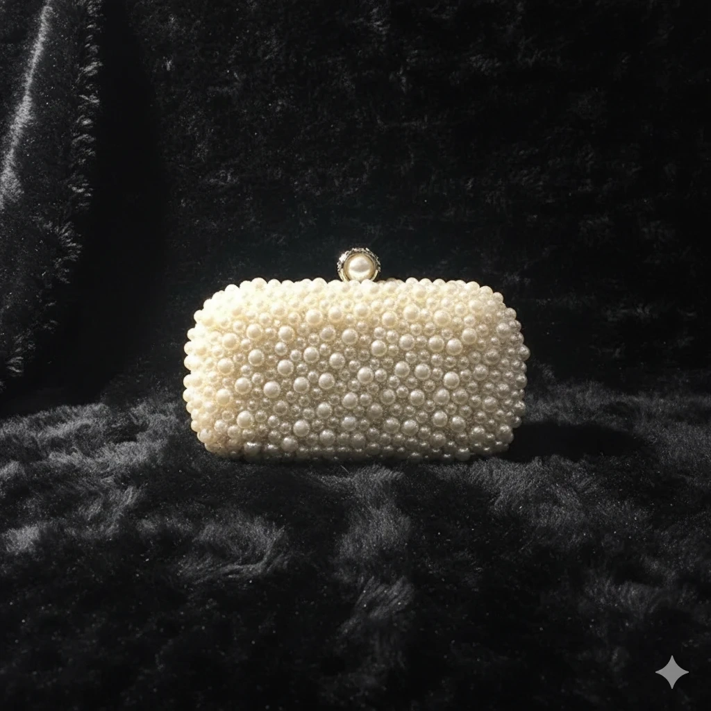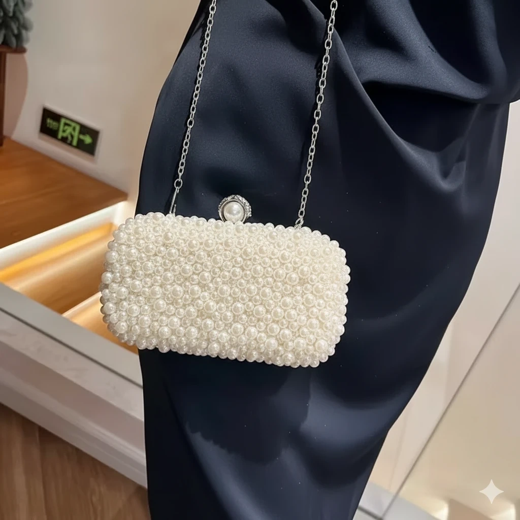 This is a beautiful pearl beaded clutch bag, perfect for a special occasion! It comes with a delicate chain strap. The interior is lined with a smooth, dark fabric. It's in great condition and ready to add a touch of elegance to your outfit