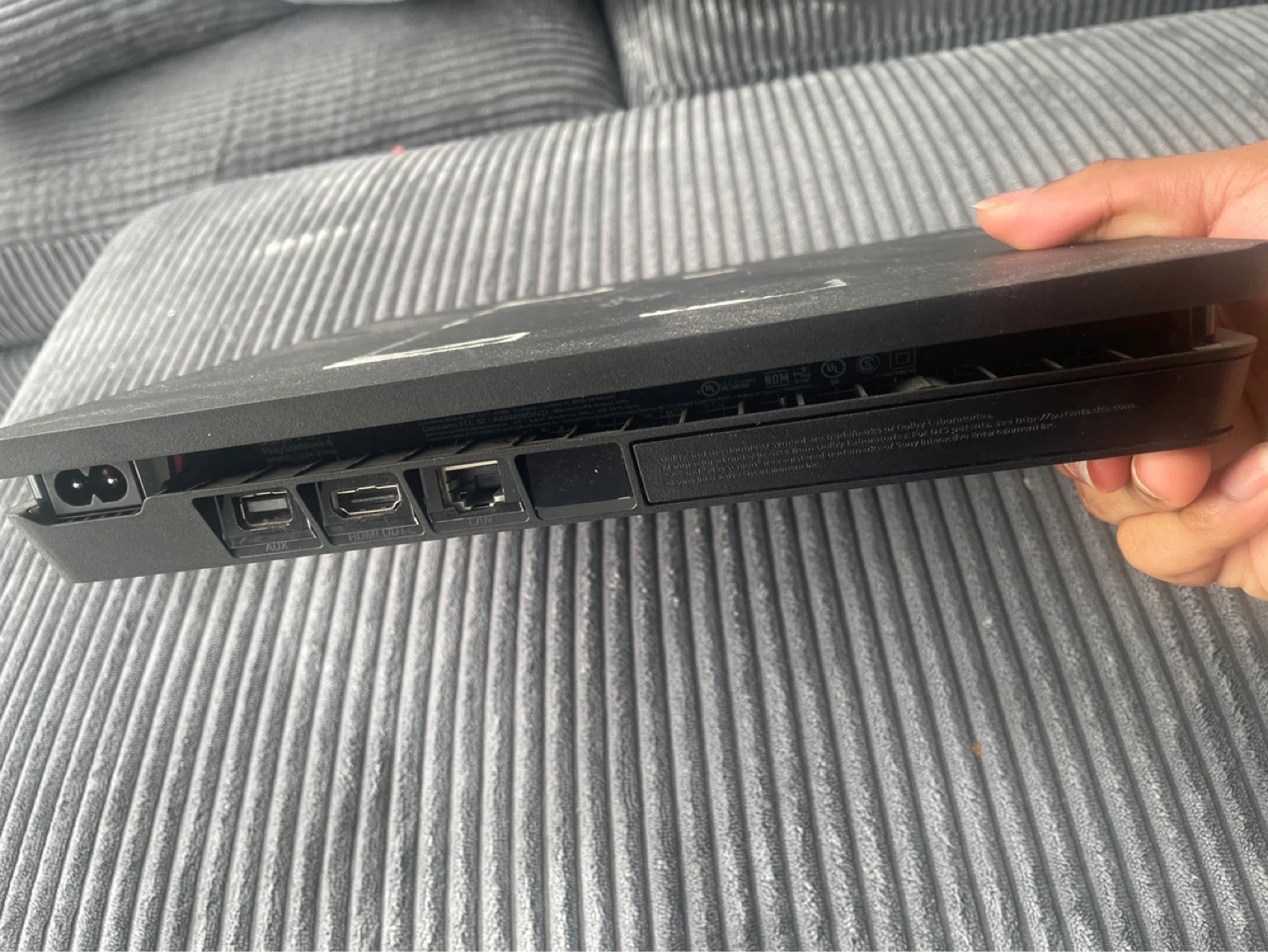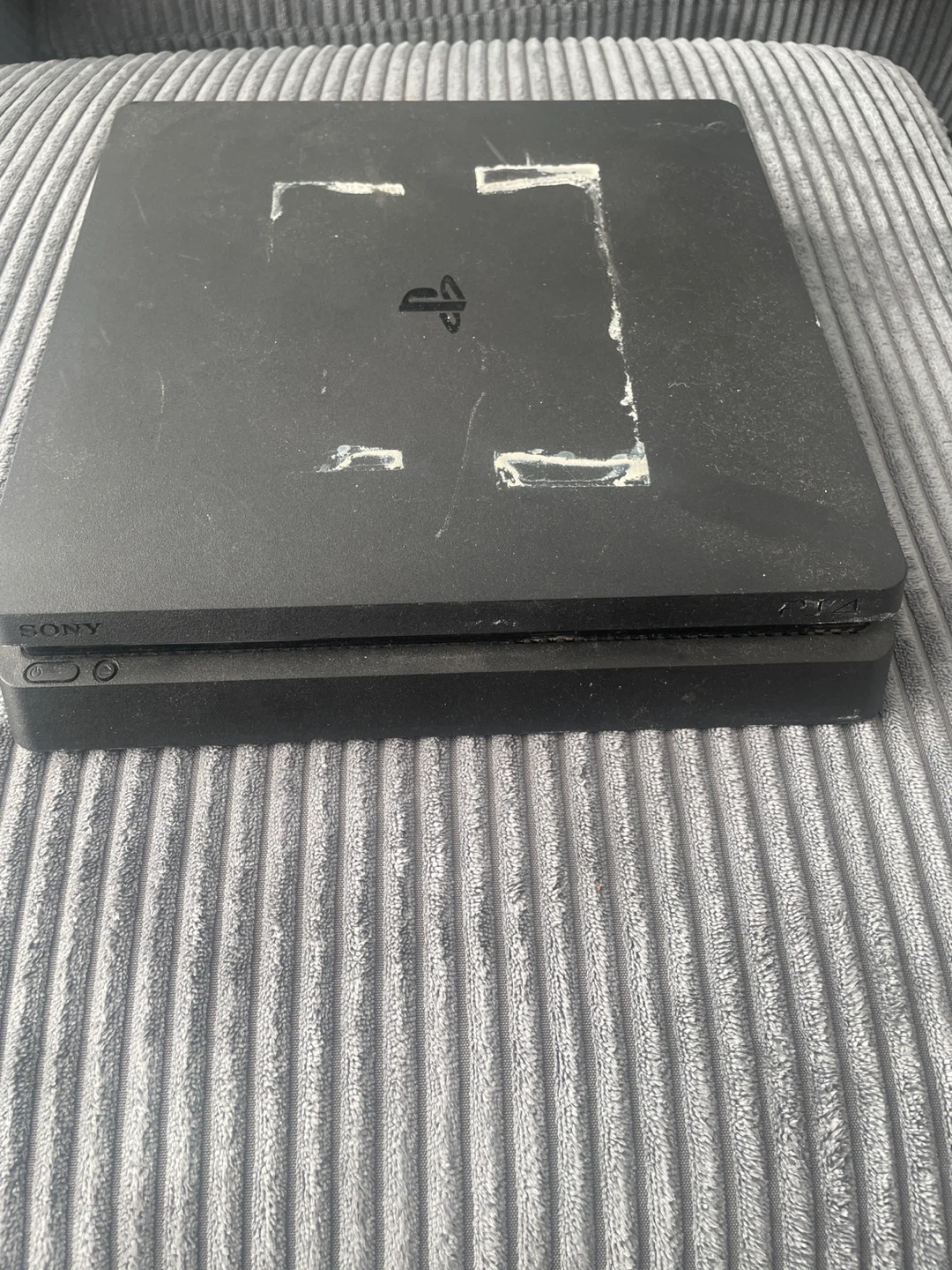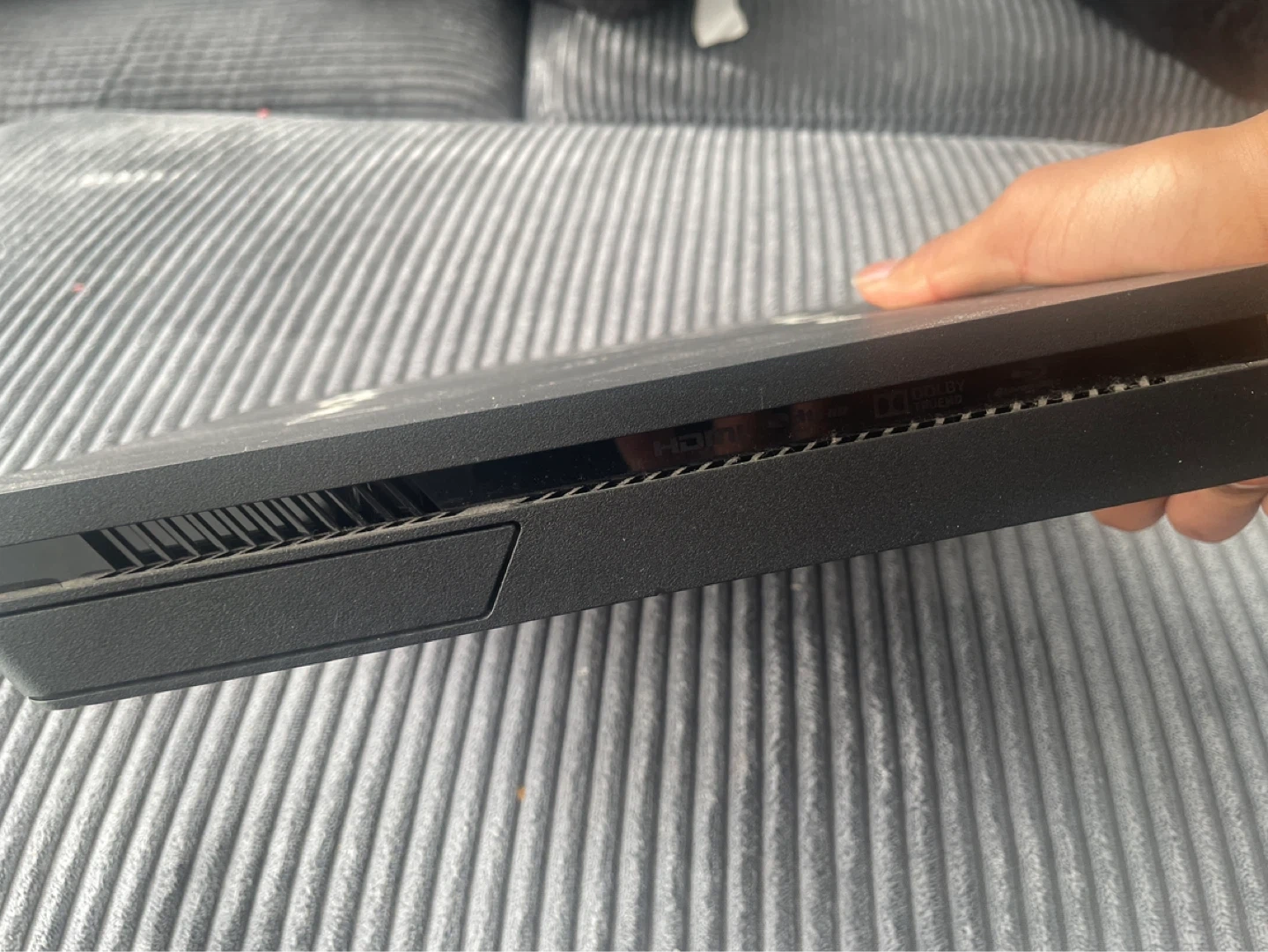 This is a black Sony PlayStation 4 Slim console. It has HDMI and USB ports. It's ready for your next gaming adventure!
