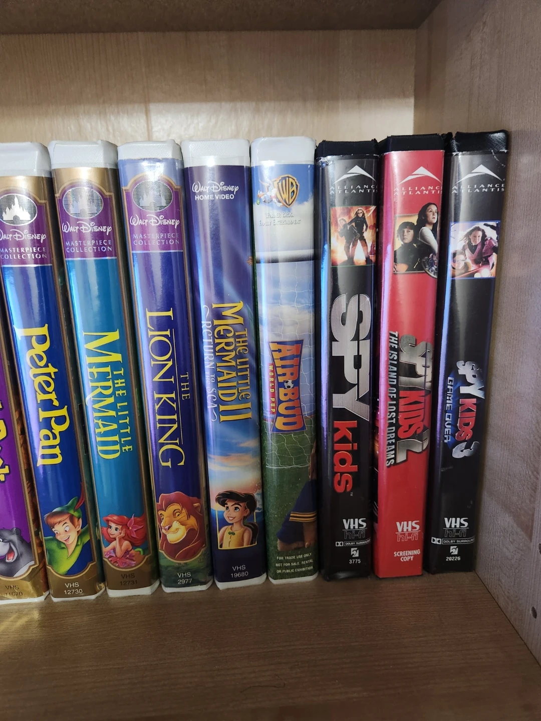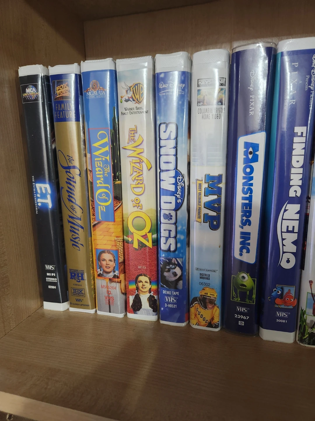 A selection of classic Disney and family movies on VHS tape. Includes titles from Pixar, Walt Disney, and Warner Bros. These tapes are great for a nostalgic movie night!
