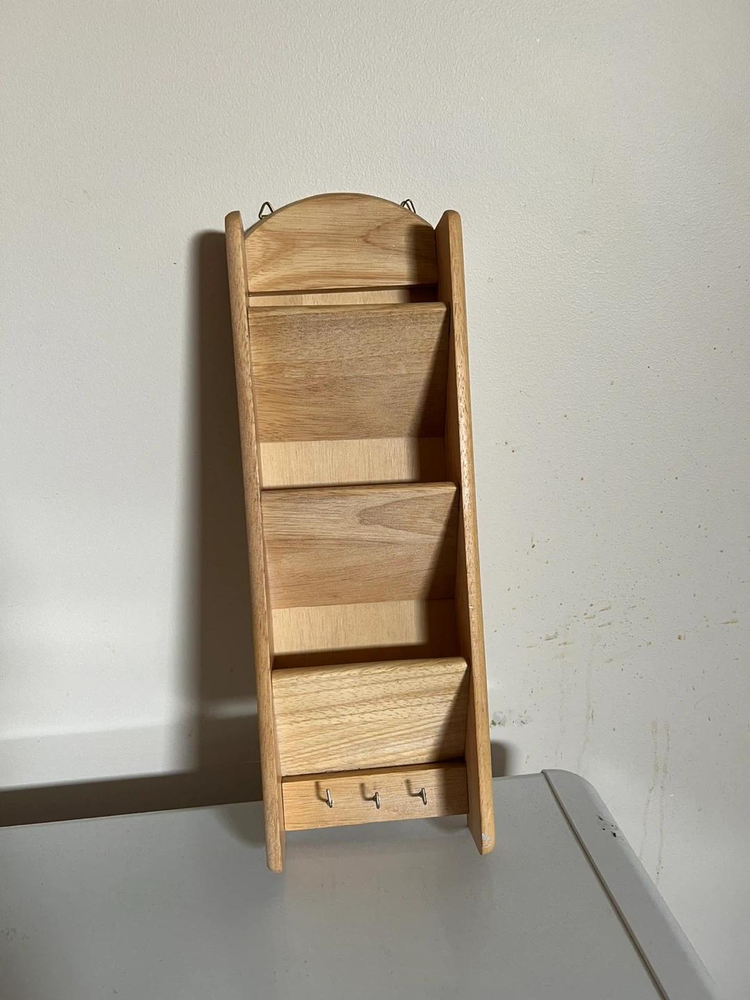 This wall-mounted sorter is made of wood and features three compartments for mail or documents. It also includes four hooks at the bottom, perfect for hanging keys. A practical addition to any entryway!