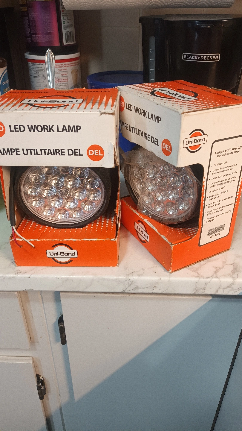 Two new Uni-Bond LED work lamps. Wide spot beam. 19 LED diodes. Low power consumption. Natural white light reduces eye fatigue. 12V application. Steel reinforced rubber-like housing. Polycarbonate lens. Adjustable zinc plated steel mounting bracket. Beam penetration up to 200 ft. Go oilers go.