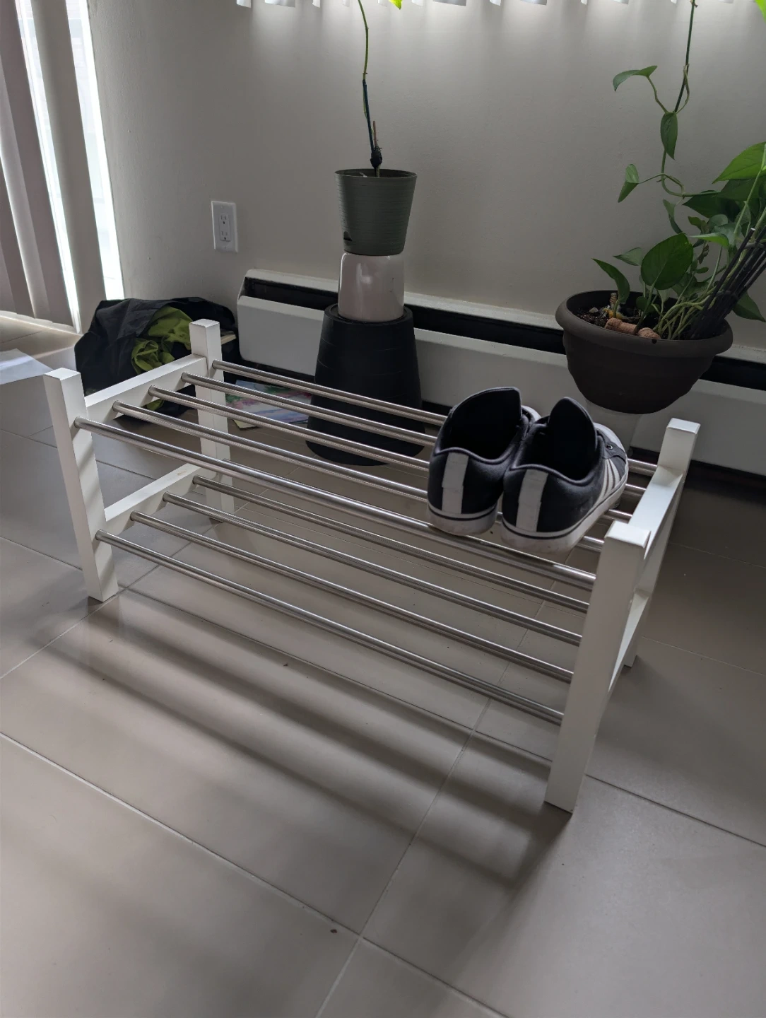 This shoe rack has a white frame with four metal shelves. It's great for organizing footwear. This rack is useful for keeping your entryway tidy!