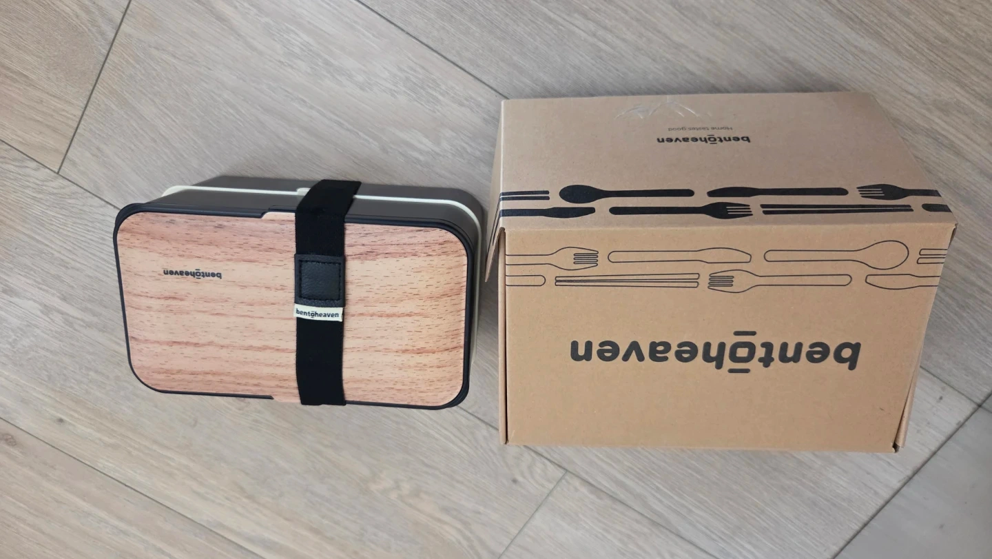 This bento box features a stylish wood grain finish on the lid and comes with a securing elastic band. It includes the original packaging. This lunch box is ideal for packing meals on the go.