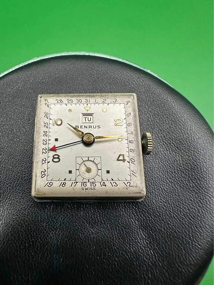 Vintage Benrus square calendar wristwatch from the late 1930s–early 1940s, featuring a classic Art Deco case and a rare multi-function dial layout. The dial is in perfect condition with no scratches, only on the glass.