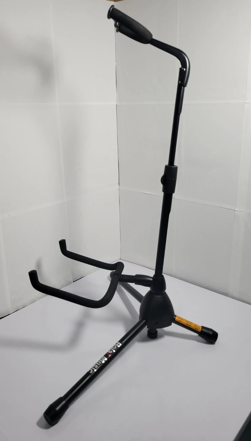 This is a black "Hola! Music" guitar stand. It has an adjustable height and designed to hold various types of guitars securely. The stand features padded contact points to protect your instrument.