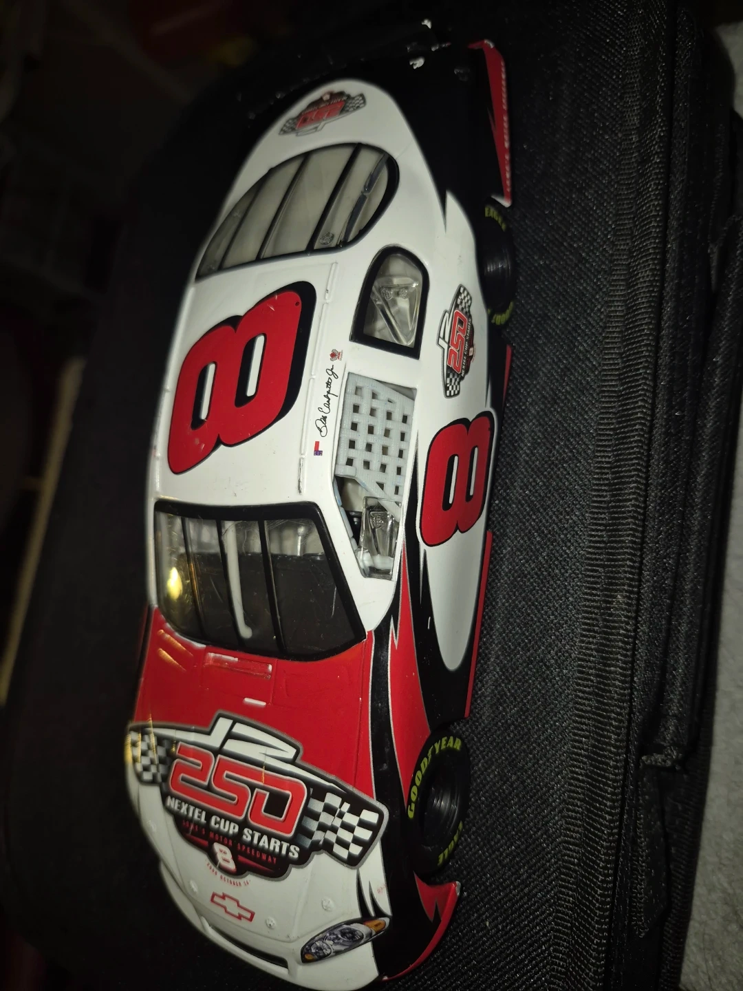 This is a Dale Earnhardt Jr. #8 NASCAR diecast car. It features "250 Nextel Cup Starts" graphics and Goodyear tires. This would be a cool addition for any NASCAR fan's collection!