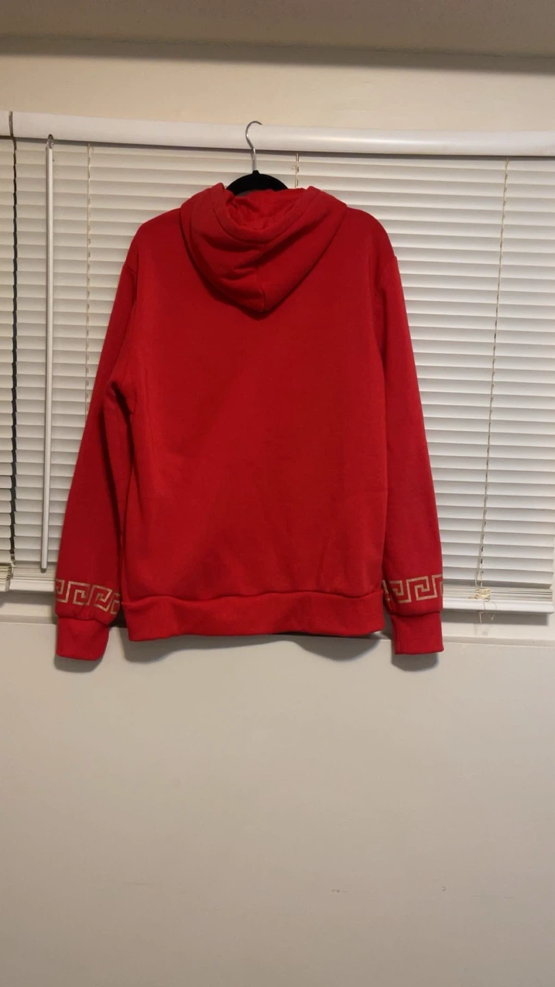 This is a red SAVAGE hoodie with a distinctive Medusa-style graphic on the front. It features a convenient front pocket and decorative Greek key patterns on the sleeves. This pullover style is great for casual wear.