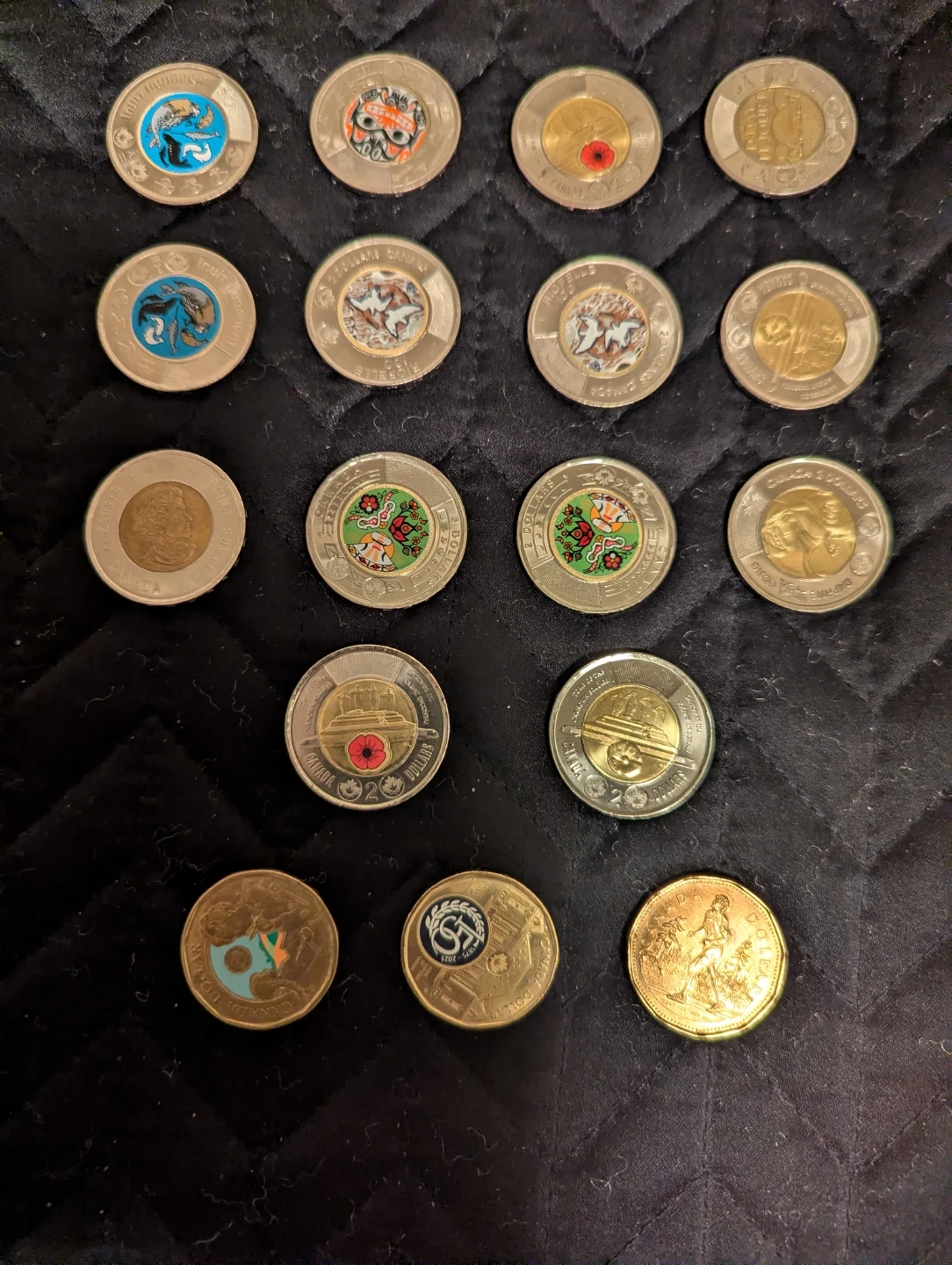 Small collection of interesting Canadian toonies and loonies usually not found in everyday change.