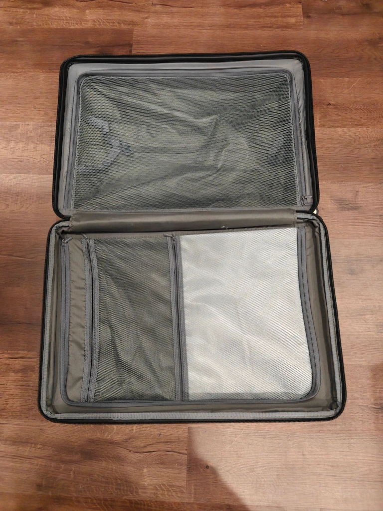 This cream hardshell spinner suitcase has a textured exterior with four wheels for easy manoeuvring. It features a spacious main compartment with securing straps and a zippered mesh pocket on the lid. It is expandable from 80L to 100L of capacity. An additional zippered compartment is present on the inside lid for better organization.