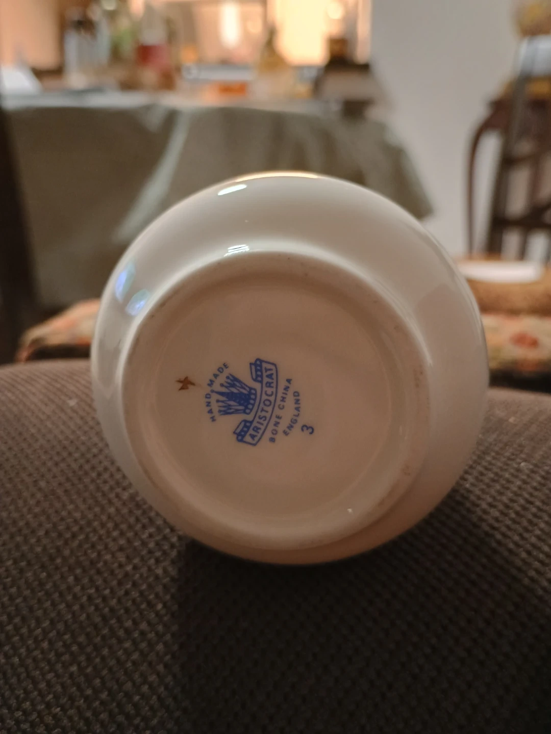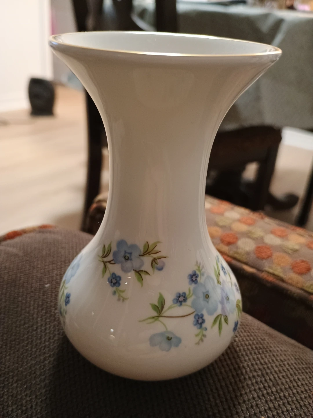 White vase with a blue floral pattern.English Bone china material. Made in England. It's a charming piece for display!