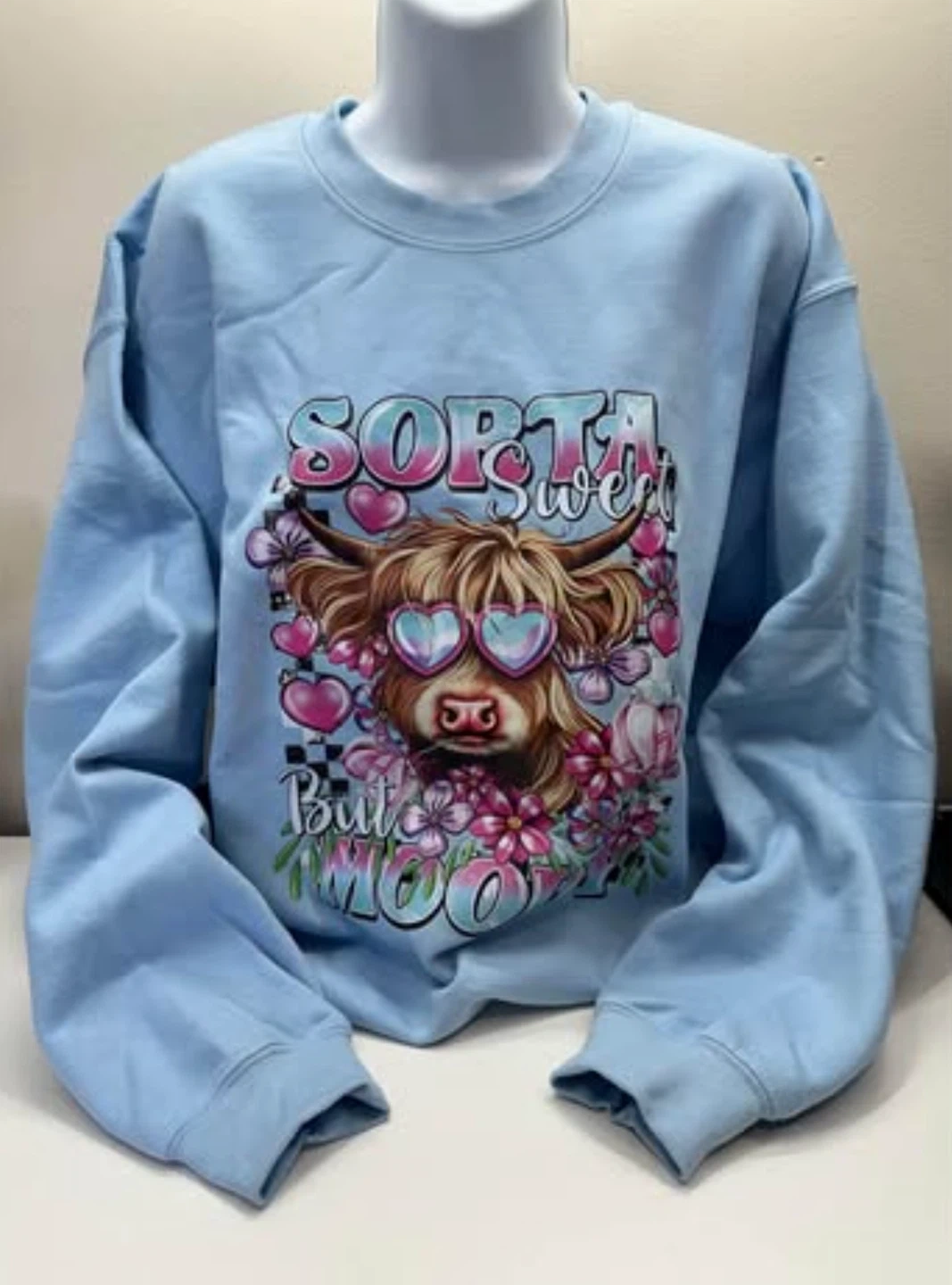 Cute light blue sweatshirt featuring a highland cow wearing heart-shaped glasses surrounded by flowers and the words 'Sorta Sweet But Moo'! Perfect for adding a bit of fun to your wardrobe