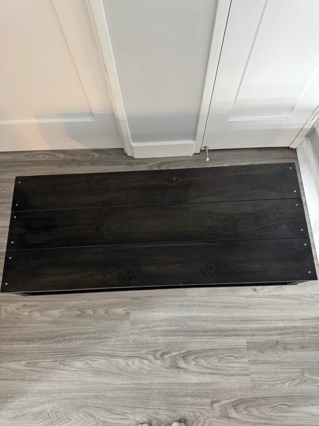 Table is made from Canadian pine and the legs are made from folded steel. Each leg has a floor protector on it at the bottom.