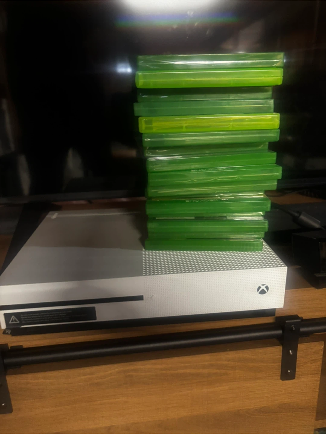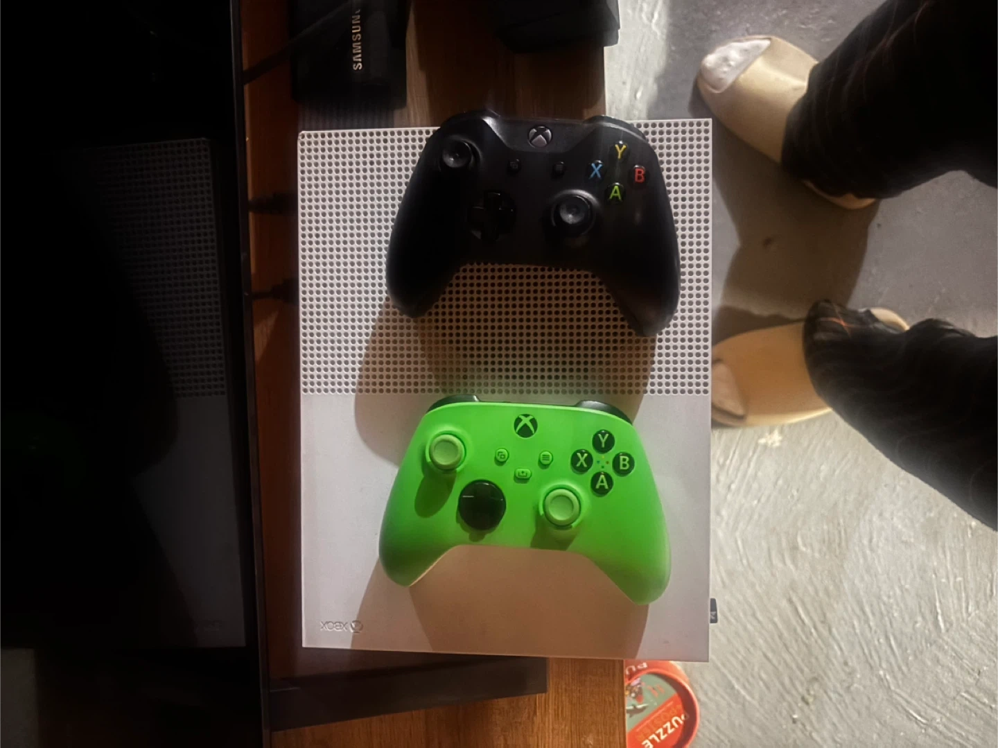 Xbox One S console comes with a stack of games and two controllers. One controller is black and the other is bright green. It's ready for gaming!