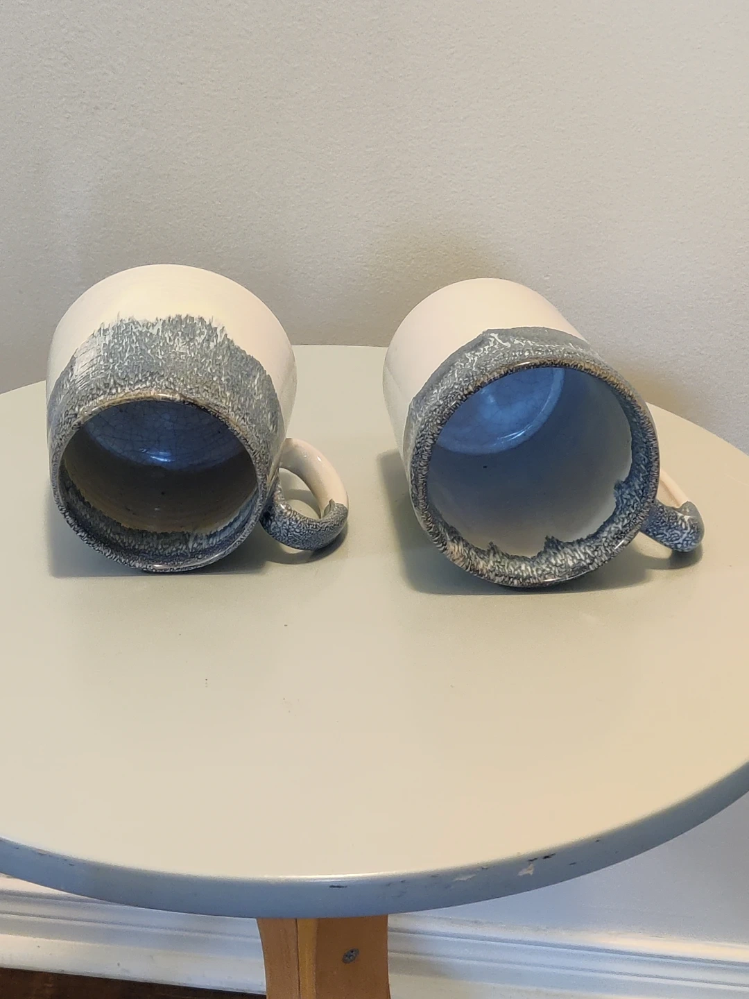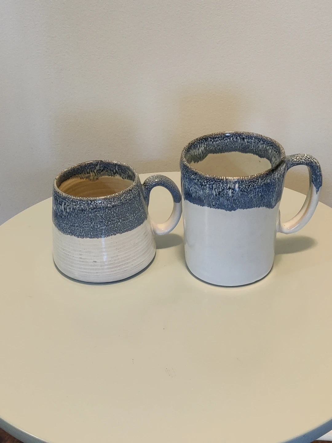 These two ceramic mugs are from Barcela and made in Portugal. They feature a cream base with a blue speckled glaze around the rim. Dishwasher and microwave safe.